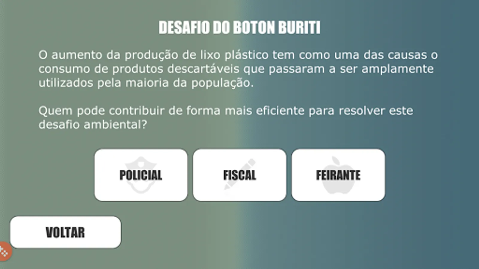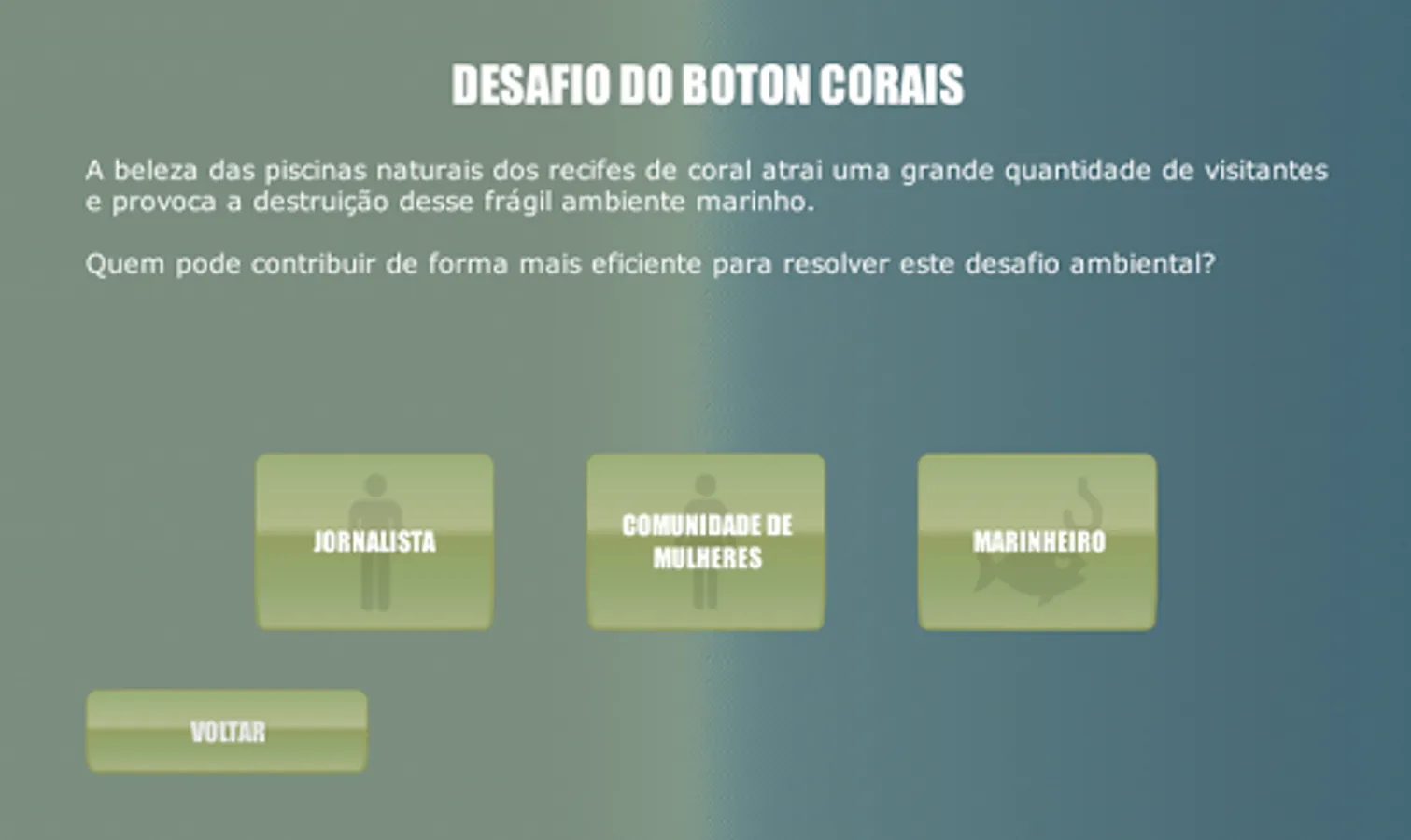 Based on extensive research, the game presents, in the form of challenges, the main environmental problems of biomes and the solutions found by different segments of society to promote their sustainable use.