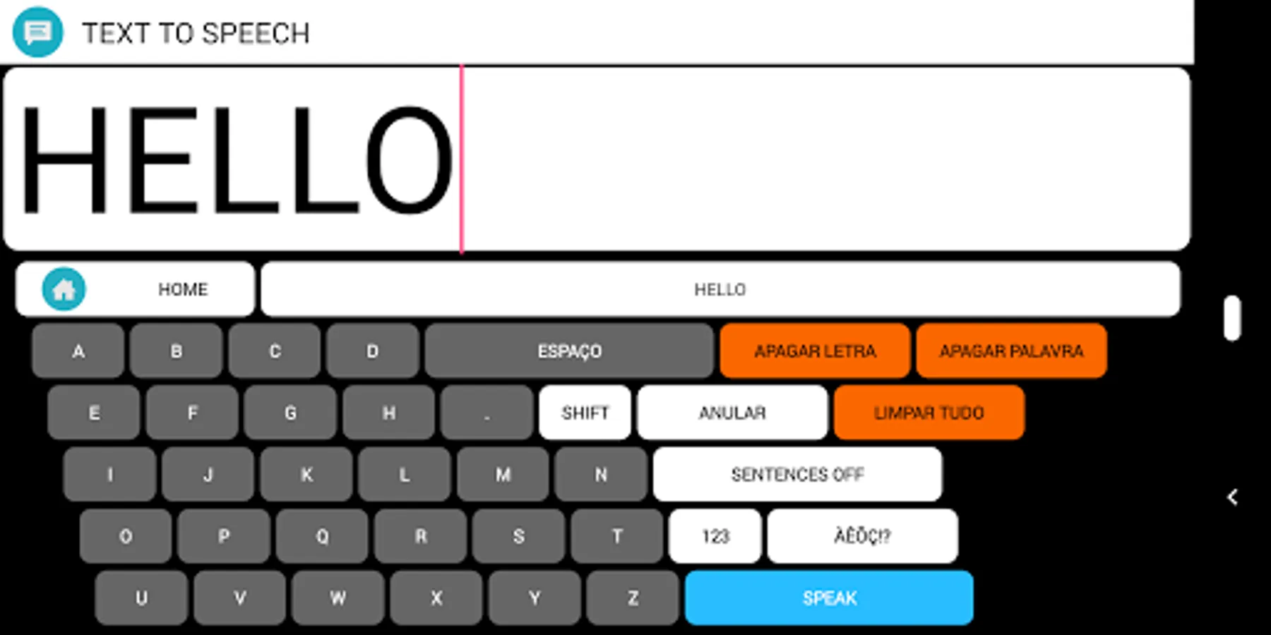 The app allows a large number of customizations (eg, scanning speed, letter size, type of keyboards, communication grid). For this purpose, another app will appear in your list of applications of your device next to the main app. If you are in direct access mode, access to the settings by tapping on the screen for 2 seconds.