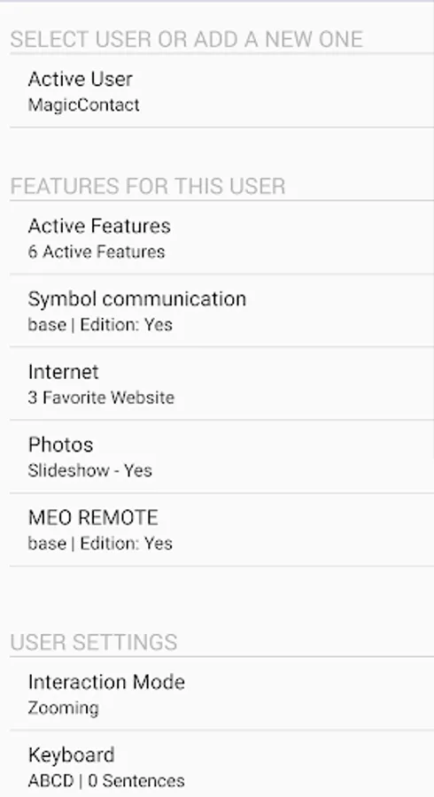 MagicContact was designed for users with speech impairments (eg, users with aphasia, ALS, cerebral palsy, or autism spectrum disorders) and who benefit from Android's voice synthesis using the "Symbol Communication" and "Text to Speech". Users with motor impairment can interact with the app through the scanning process, in addition to direct access.