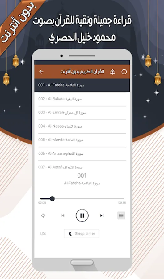 Now you can use the application with ease and listen to the surahs of the Noble Qur’an with the voice of Sheikh Mahmoud Khalil Al-Hosary, and live a wonderful state of faith in which you delve deeper into the meanings of the Noble Qur’an, enjoying the voice of Sheikh Mahmoud Khalil Al-Hosary, who transports you to another world with his distinctive voice.