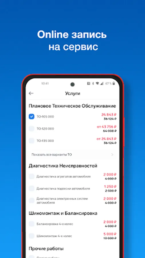 - choose a service and find out its cost: scheduled maintenance, fault diagnosis, tire fitting and balancing;
