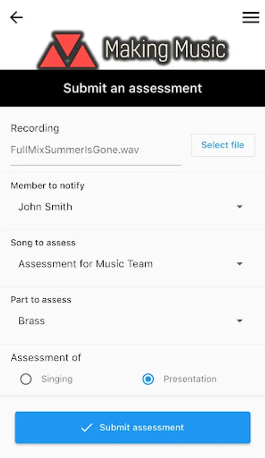 Submit riser tapes for assessment direct from your voice-recorder app (share the recording to the Making Music Platform app), and view/listen to all previous submissions