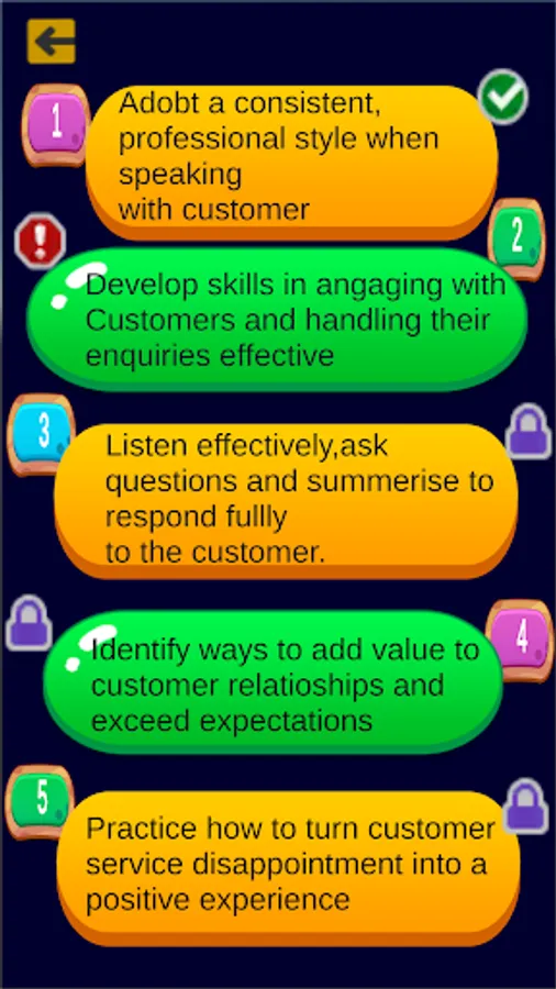 There are five levels in this game, having completed the learning phase of each level; there are some sets of questions to test your knowledge just so you can move to the next level. These challenges are prerequisite for the players to move to the next level. The player has to critically examine and choose the right conversations between the client and customer service representative.