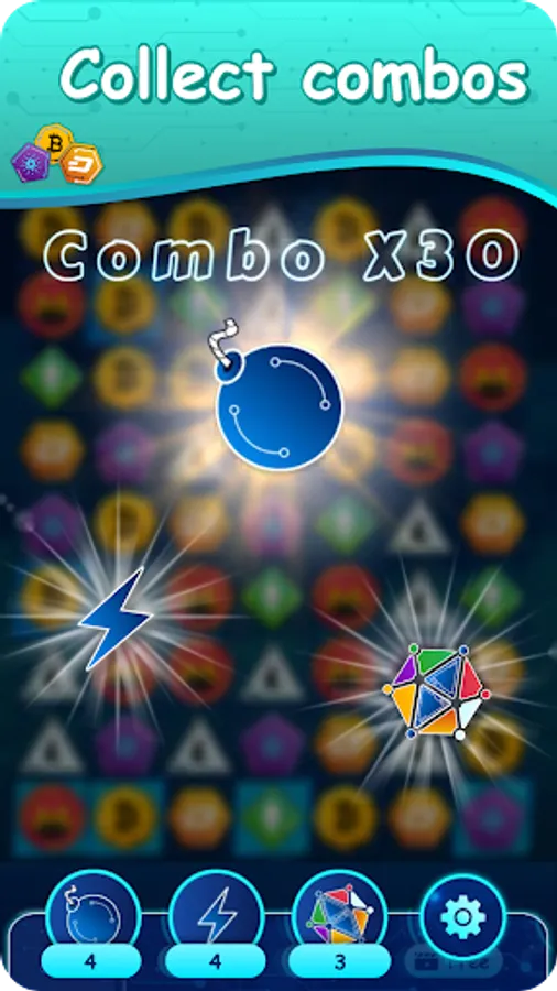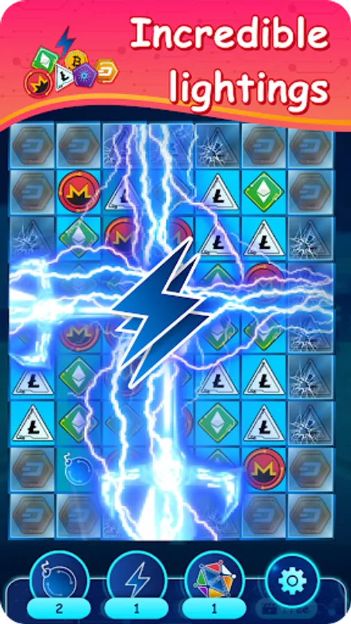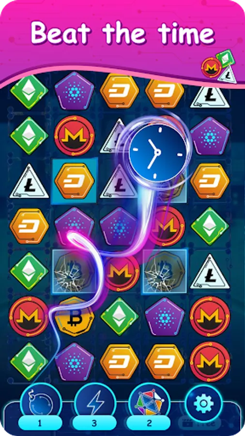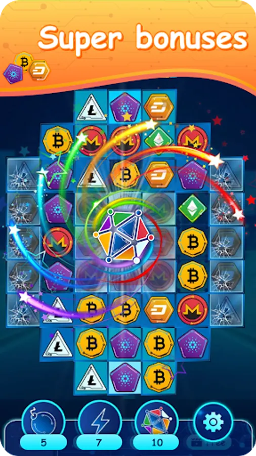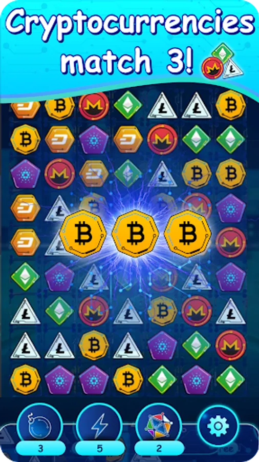 Crypto gems is a three-in-a-row game with an unexpected scenario for collecting gems with cryptocurrency symbols.