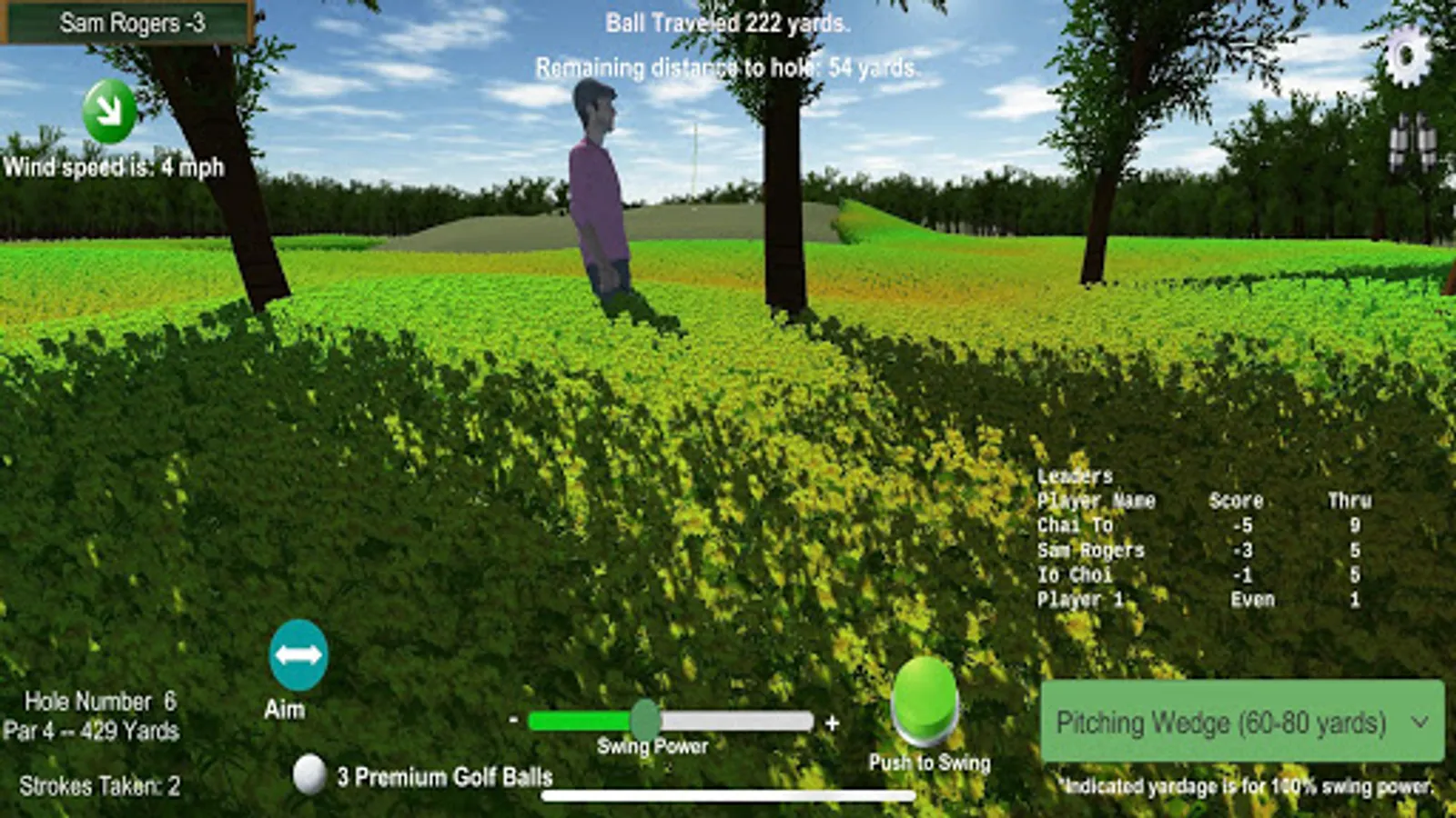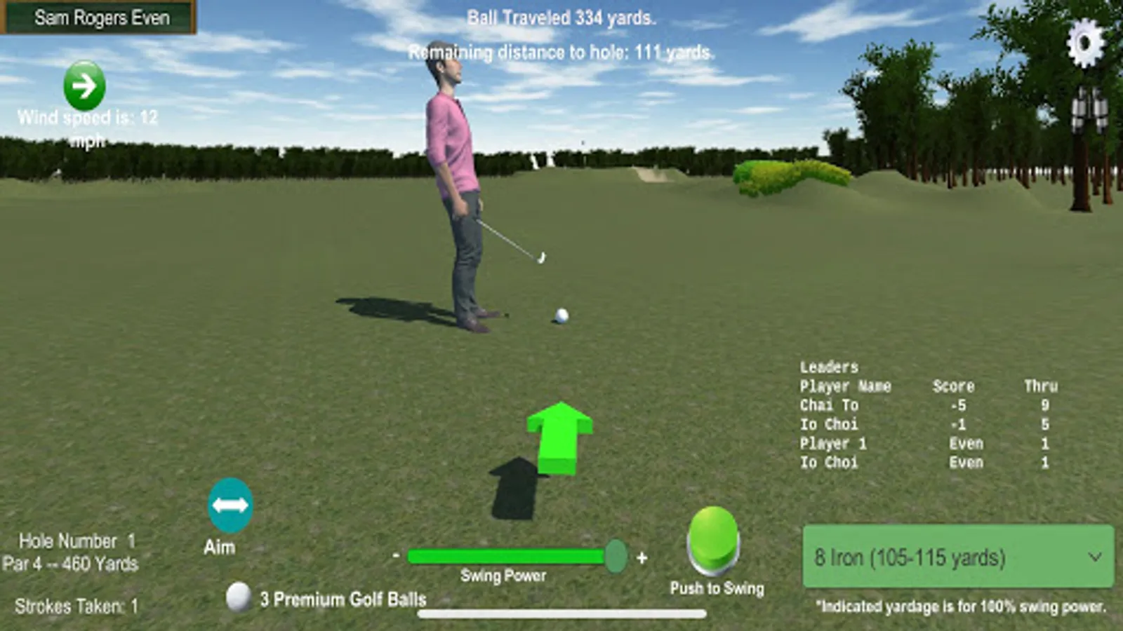 18 hole realistic and challenging golf game, with daily leader-board for all golfers playing worldwide. Full set of golf clubs provided with specialty clubs (Gap Wedge and 60 degree Wedge available). Tournament length golf course. Avoid the sand, trees, rough and water hazards for a good score. Play the 18 hole Hampton's East golf course (Par 72). Capitalize with some good scores on the front nine and prepare for a much more difficult back nine. Random wind that blows through the golf course will create challenging conditions at times. Enhanced golf balls available.