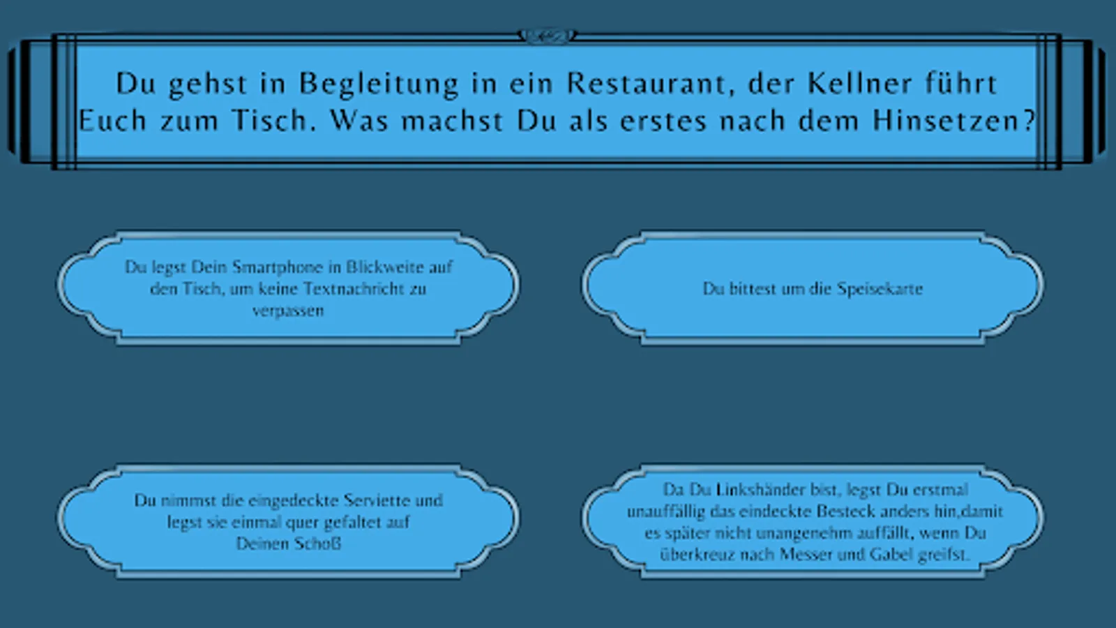 MannersToGo is a modern good manners app for young people with advice and quiz content. Using different life situations, it is shown how to behave appropriately towards other people in professional and private life.