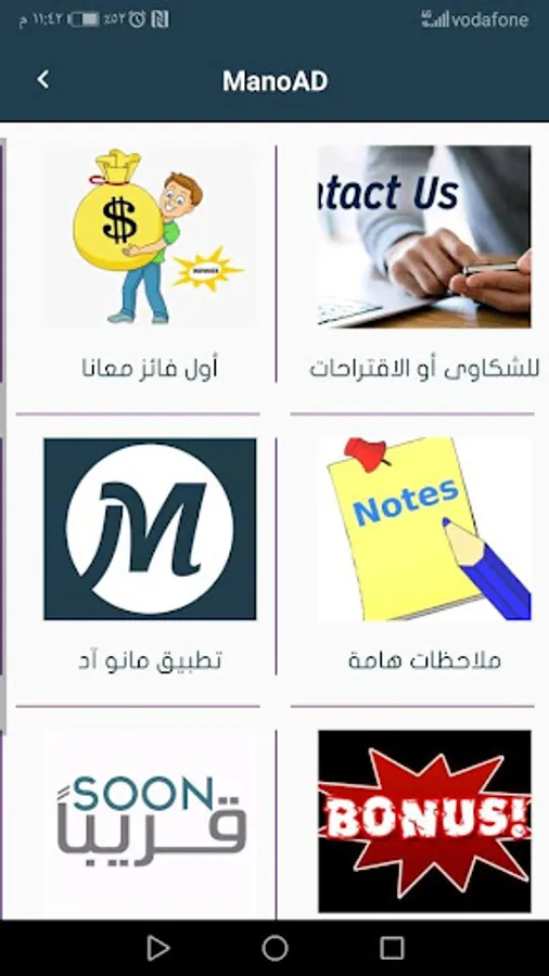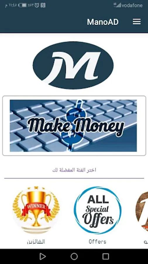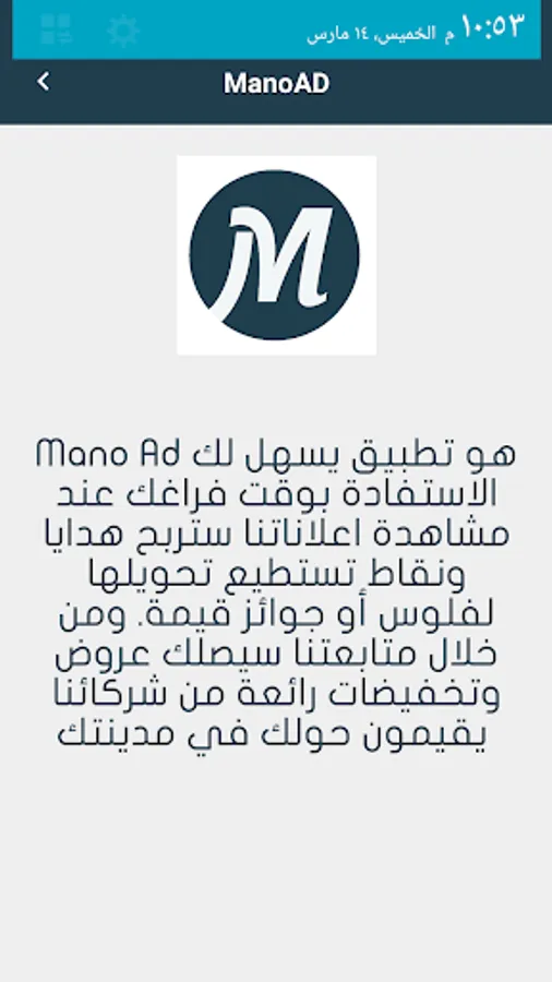 Mano هو تطبيق يسهل لك الاستفادة بوقت فراغك عند مشاهدة اعلاناتنا ستربح هدايا ونقاط تستطيع تحويلها لفلوس أو جوائز قيمة. ومن خلال متابعتنا سيصلك عروض وتخفيضات رائعة من شركائنا يقيمون حولك في مدينتك ."