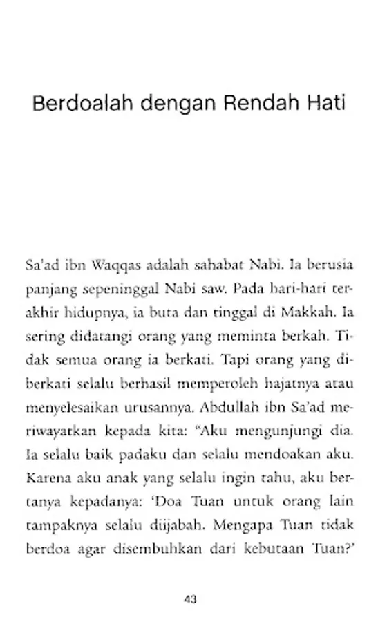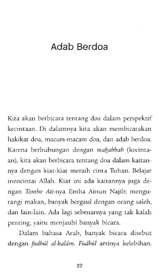 In this book Kang Jalal, Jalaluddin Rakhmat's nickname, enriches our understanding of prayer. We are also treated to how best our attitude is in praying, the interpretation of prayers, and a series of prayers that we can offer to the Creator. Be prepared to get enlightened while enjoying stories and narrations that make our heads nod while muttering, "Our attitude in praying should be like this." Also enjoy the secret behind our prayer readings and their relevance to our daily lives which are not always easy to pass.