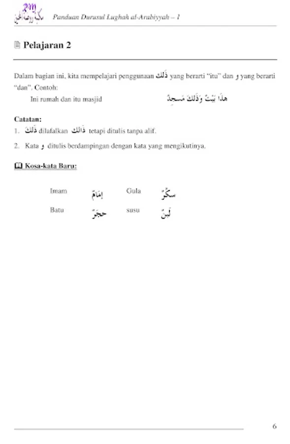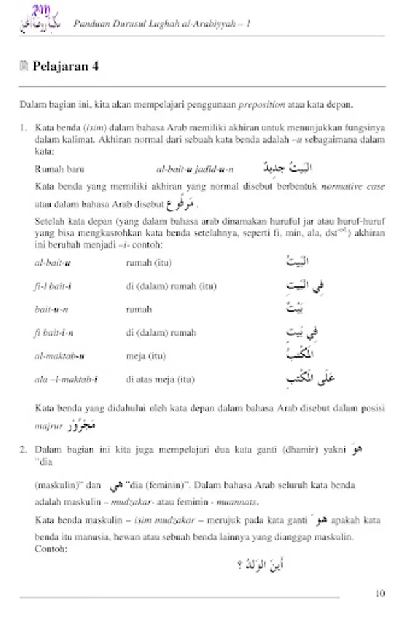 Alhamdulillah, with the help from Allah, Maktabah Raudhah al-Muhibbin can present to a dear reader who has a high interest in learning Arabic in order to understand the book of Allah, the translation of the guide Durusul Lughah al-Arabiyyah volume 1.
