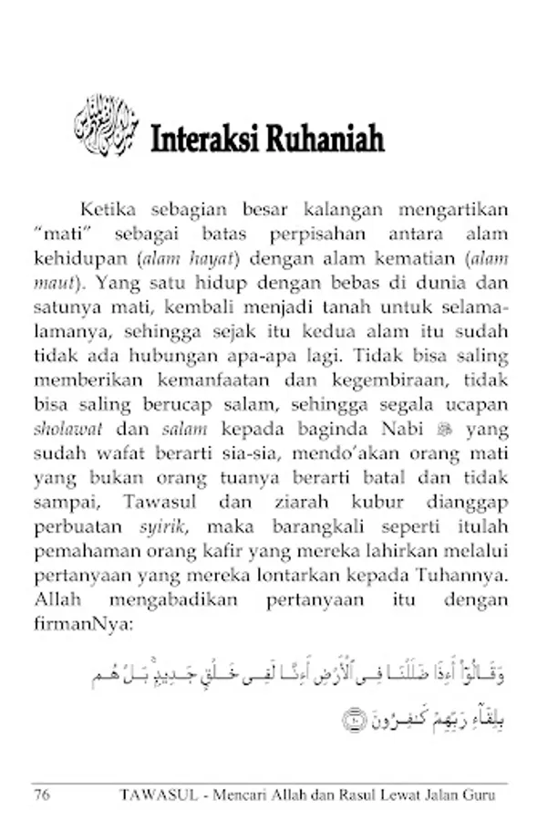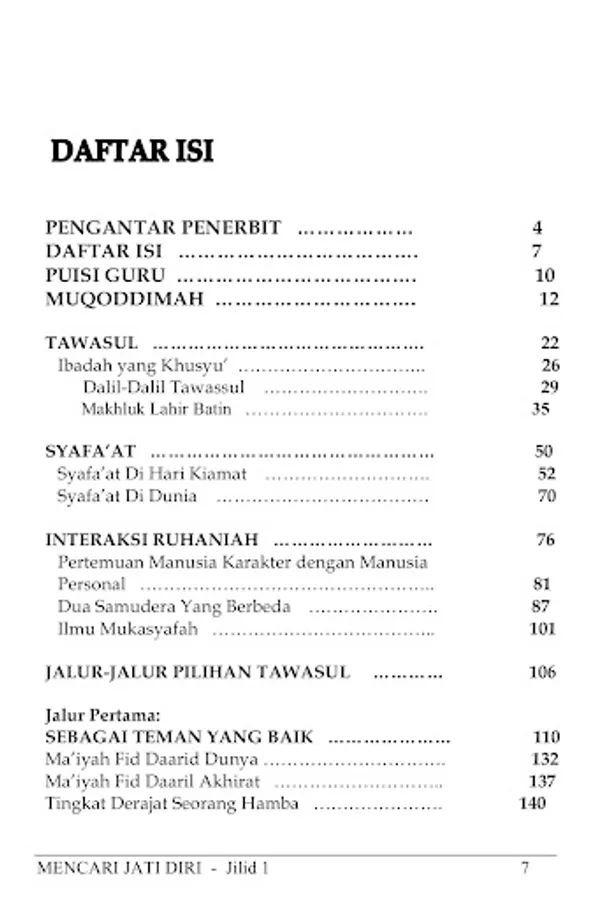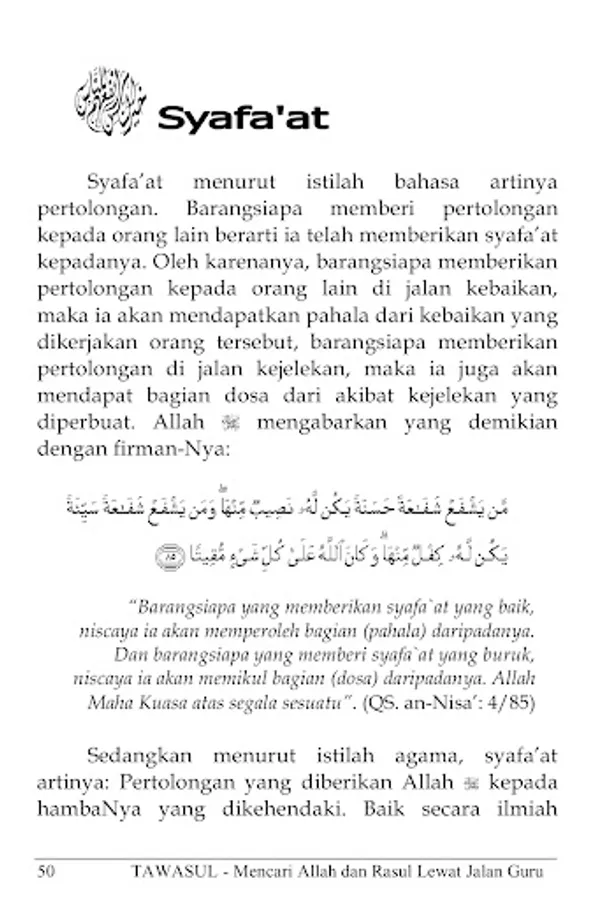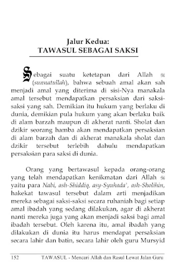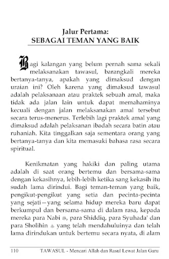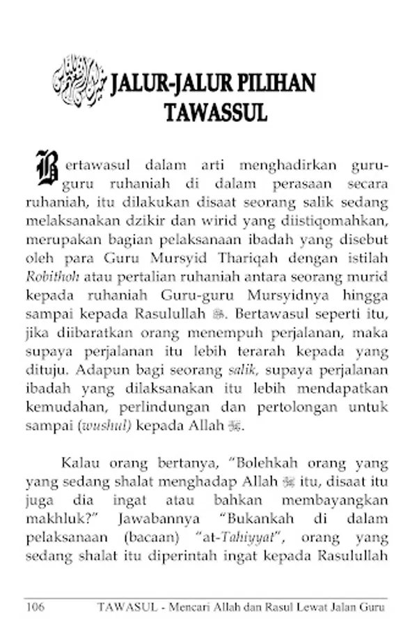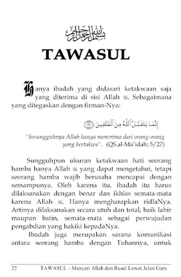 There is a saying: "Whoever works without a teacher, his teacher is a devil". Whereas humans are worshiping alone in remote places. How at that time he could do good by getting the guidance of a teacher?. Then "Tawasul Spiritually" is the solution. Tawasul spiritually is explained in detail in this TAWASUL book so that the deeds of worship that are being carried out by a servant are not trapped in the hidden tricks of Satan, which can result in humans falling into mistakes that are difficult to realize.