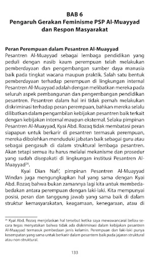 The presence of this book is expected to be able to contribute to the development of discourses and theories about Islamic boarding schools and feminism studies. This book can also be used as a reference by the government, academics and Islamic boarding school activist groups who wish to develop and find solutions to various problems both ideological and practical.