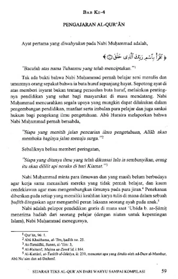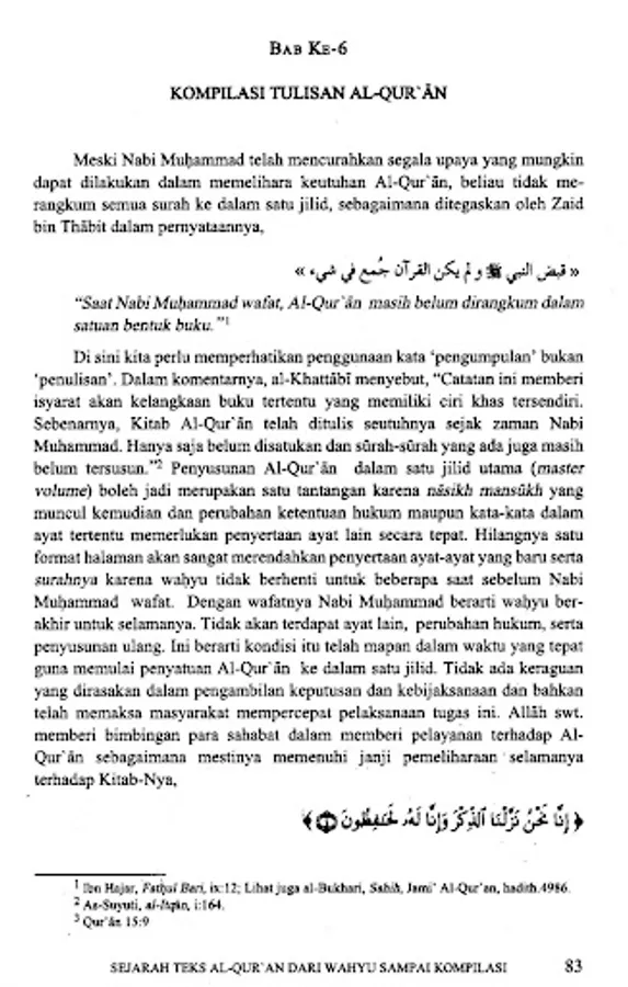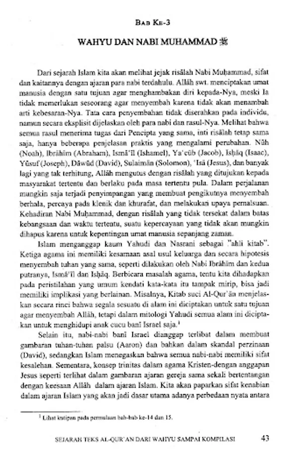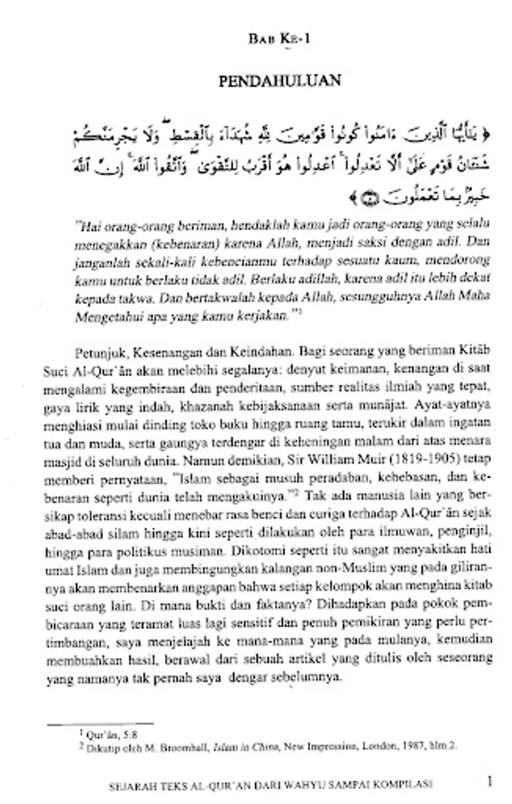 This book presents straightforward ideas about the holy book of the Koran and its preservation system and at the same time dissects the negative tricks and targets of the orientalists. The origins of receiving revelation, the role of the Prophet Muhammad. in the socialization of his teachings, the collection of verses and the setting of the final text were thoroughly discussed by the author. The topics of discussion cover, among other things, the origins of Arabic texts, as Mushaf Ibn Masud is called, the strict methodology embodied in data processing, and all types of manuscript fragmentation. Through a comparative system, the author demonstrates his intellect in uncovering the history of the Old and New Testaments based on on original sources in proving the various alterations that occurred in the Bible.