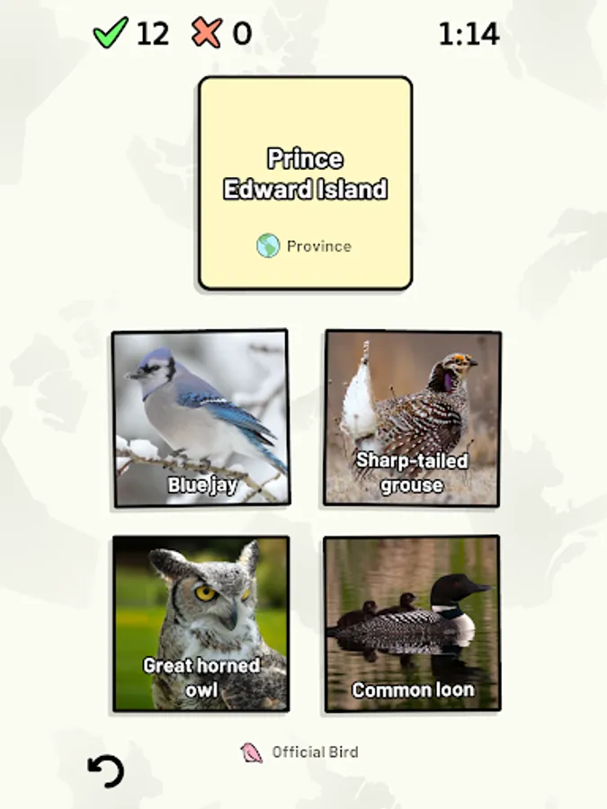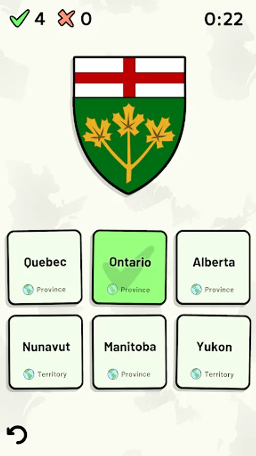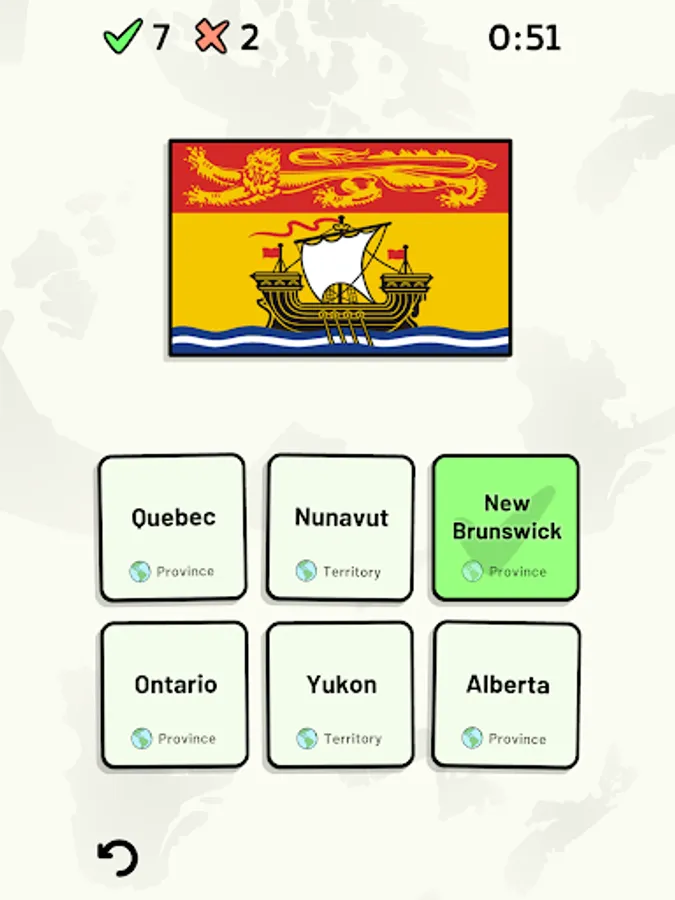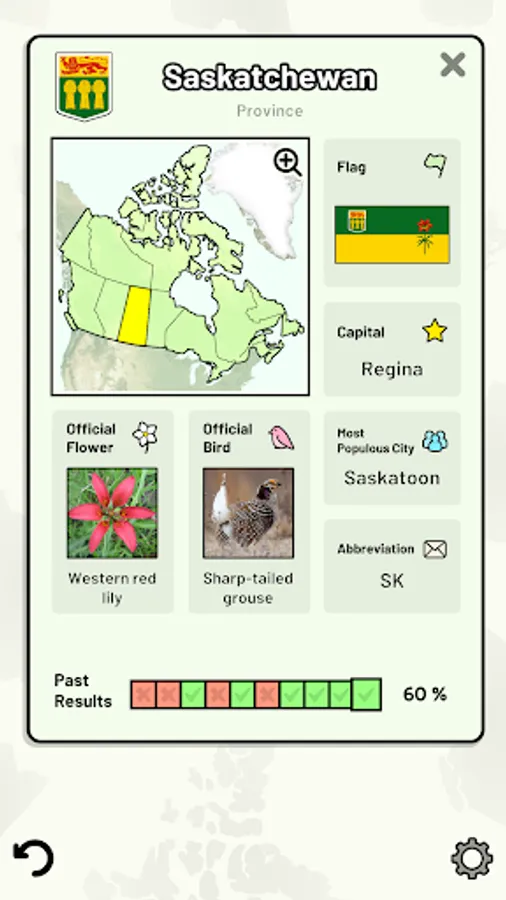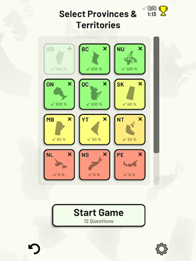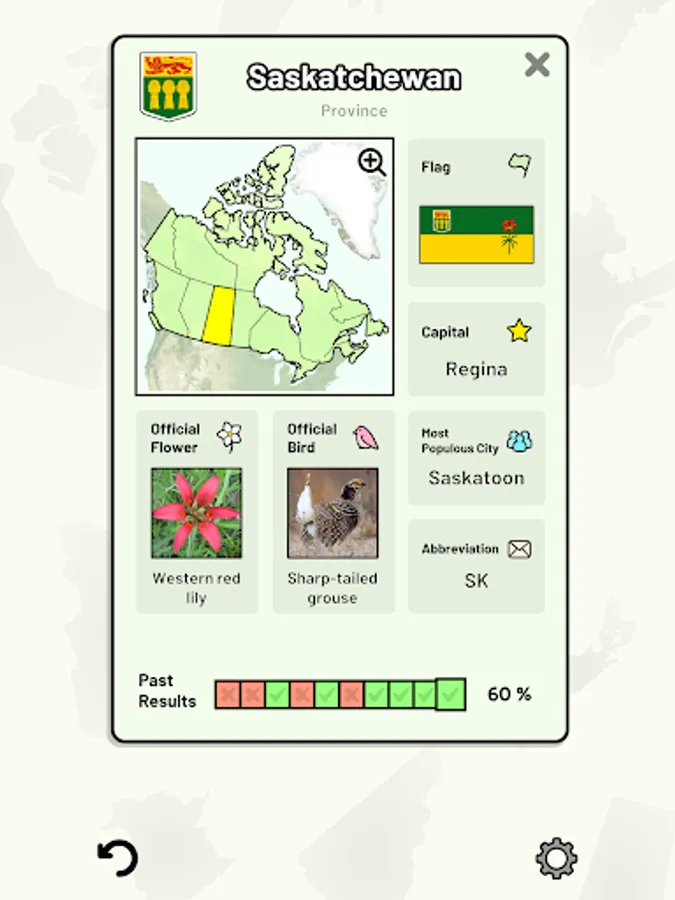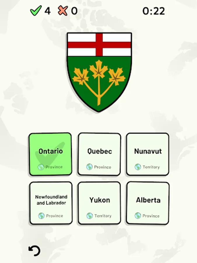 Customizable quizzes allow you to choose which of Canada's provinces and territories to test, as well as the topic. Past results for each Canadian province and territory are displayed to highlight your progress at each topic. Standard quizzes allow you to learn each topic by progressing through a series of levels.