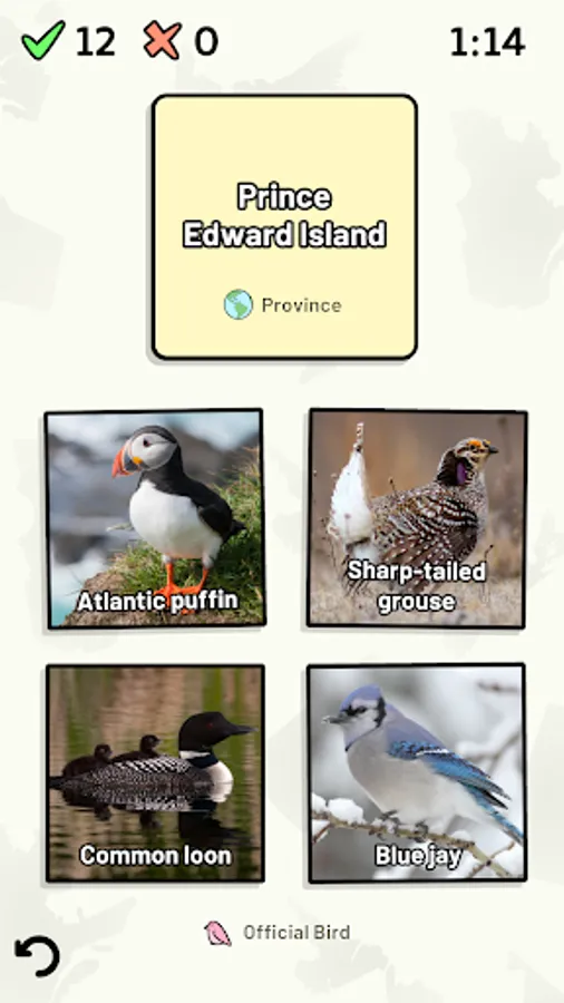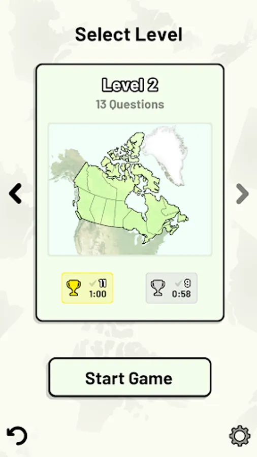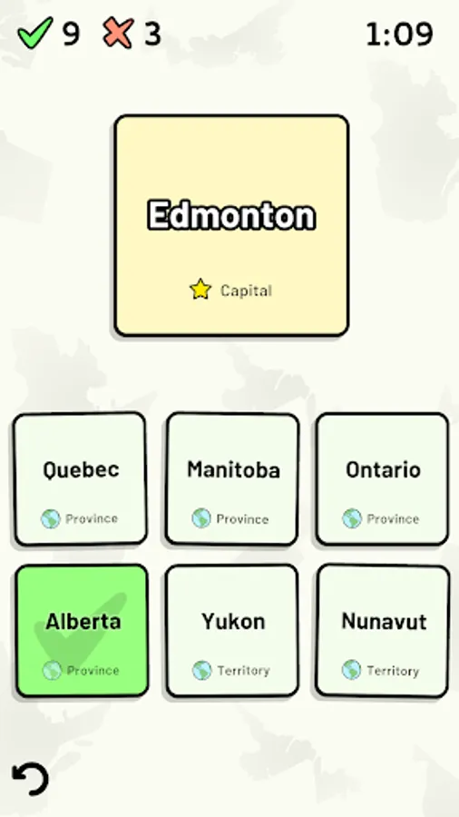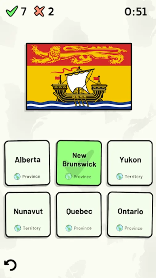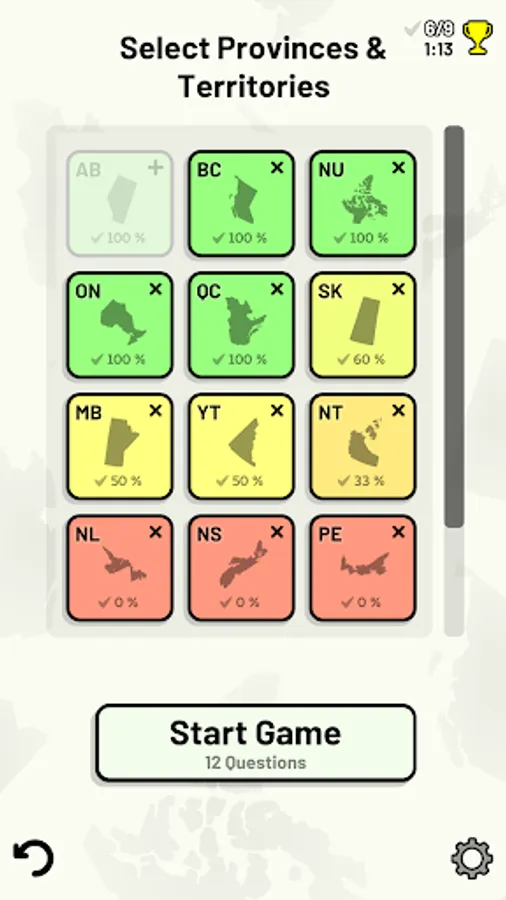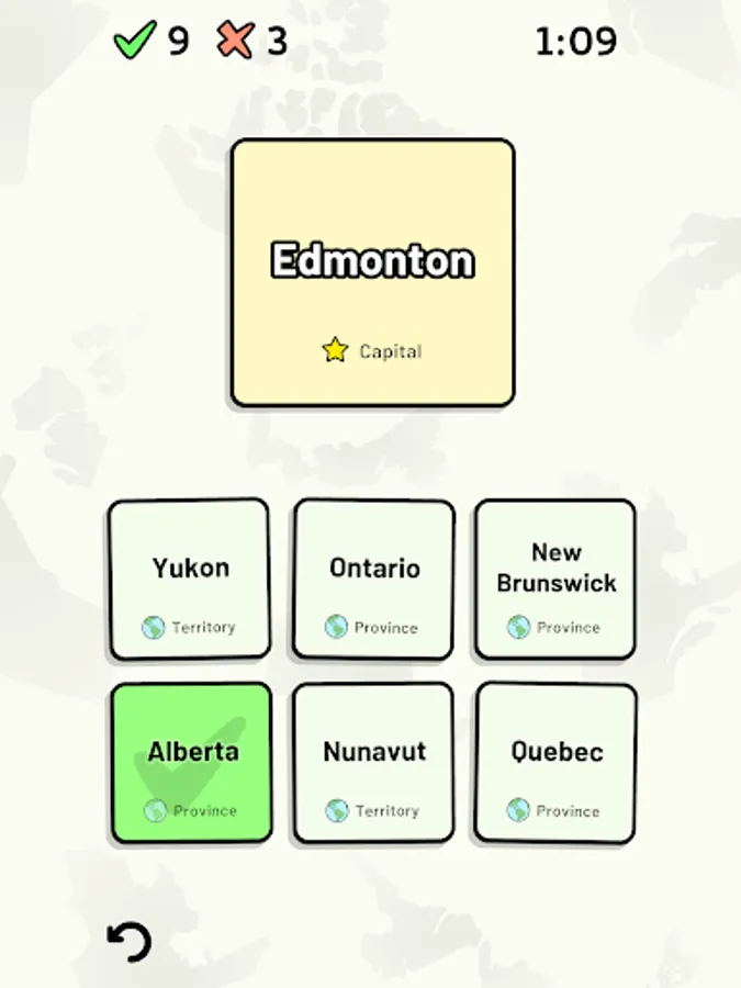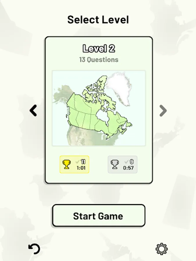 Customizable quizzes allow you to choose which of Canada's provinces and territories to test, as well as the topic. Past results for each Canadian province and territory are displayed to highlight your progress at each topic. Standard quizzes allow you to learn each topic by progressing through a series of levels.