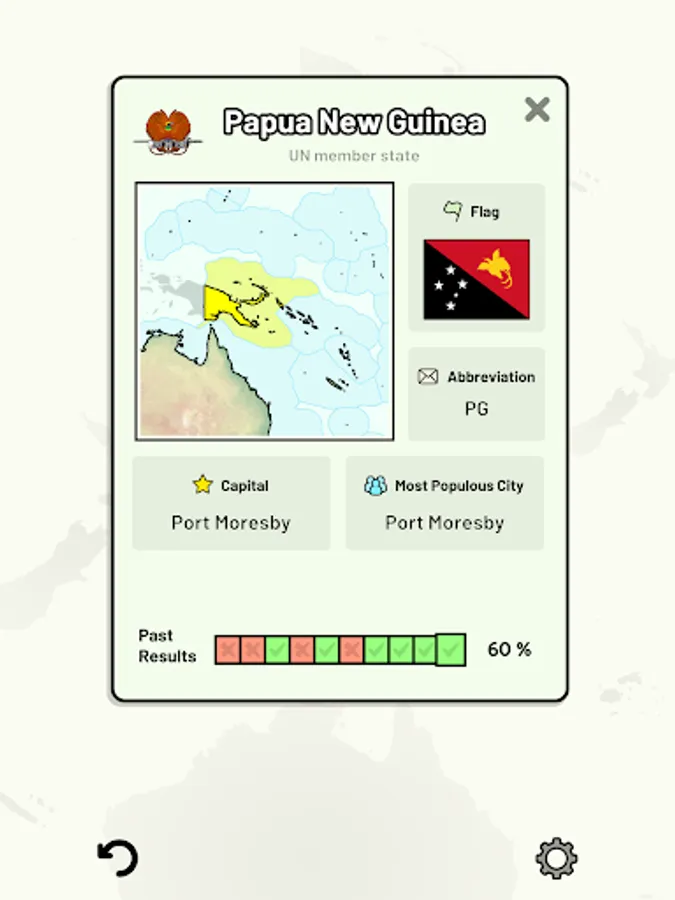 Customizable quizzes allow you to choose which countries to test, as well as the topic. Past results for each country are displayed to highlight your progress at each topic.
