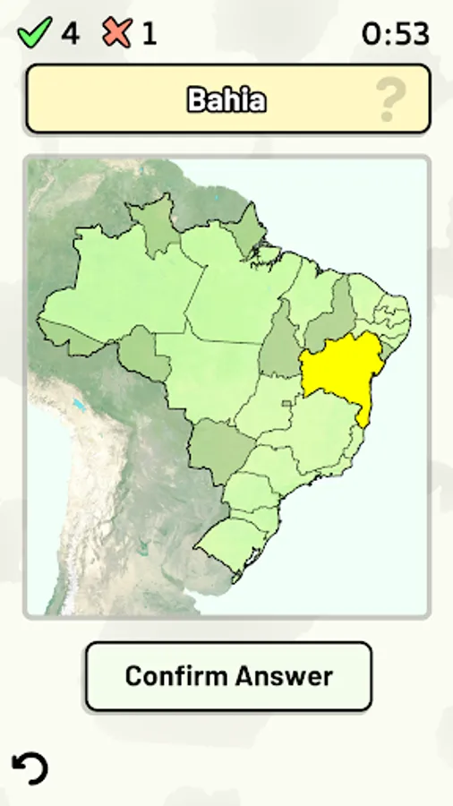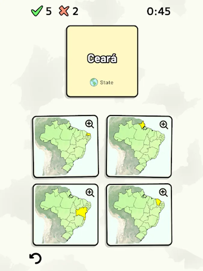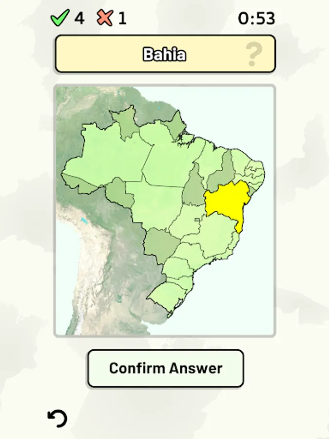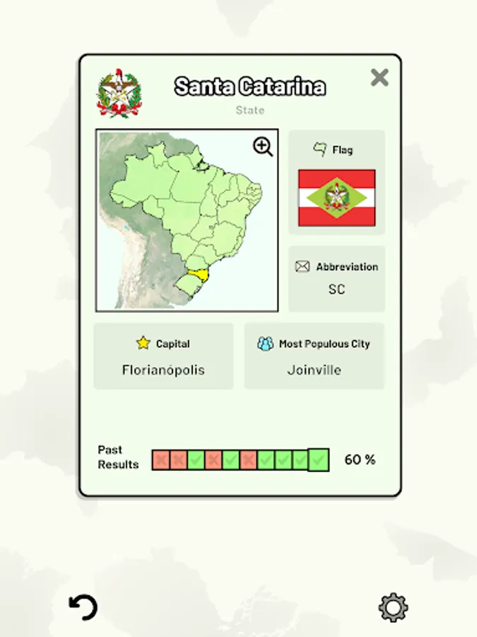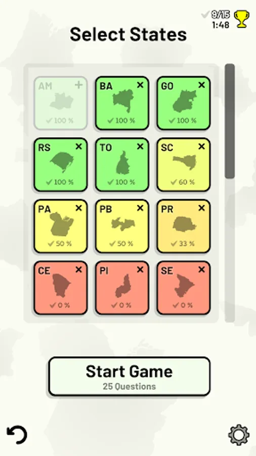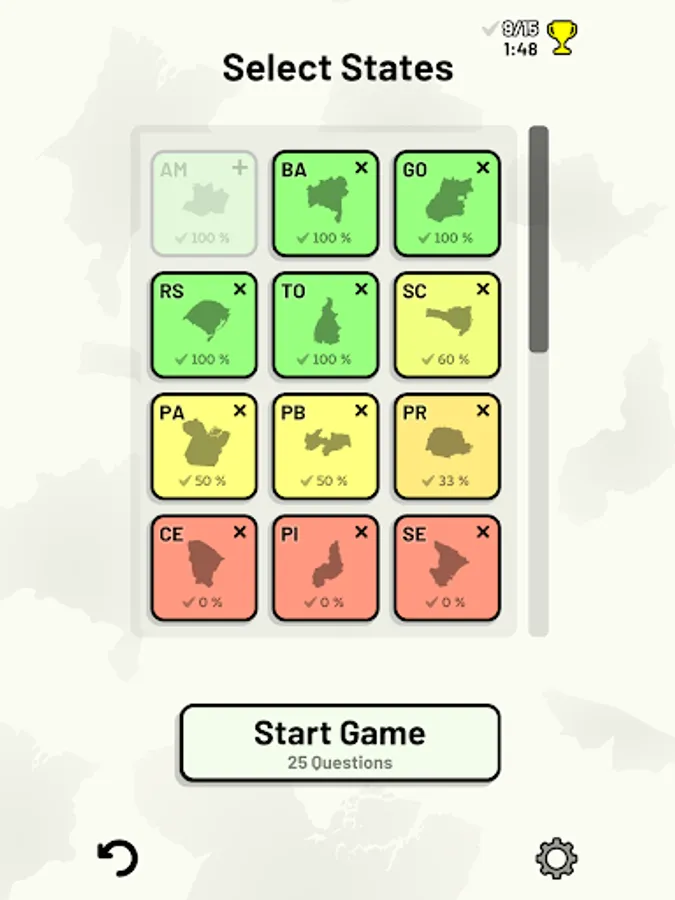 Customizable quizzes allow you to choose which states to test, as well as the topic. Past results for each state are displayed to highlight your progress at each topic.