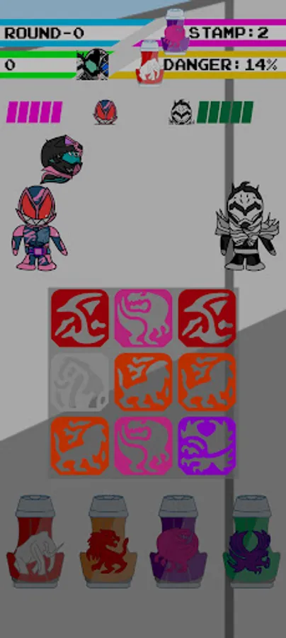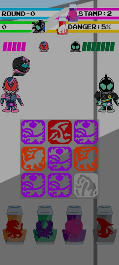 Help Rider Revi with buddy Vice to get 3 of same vice stamps in a row (up, down, across, or diagonally) to activate combo attack
