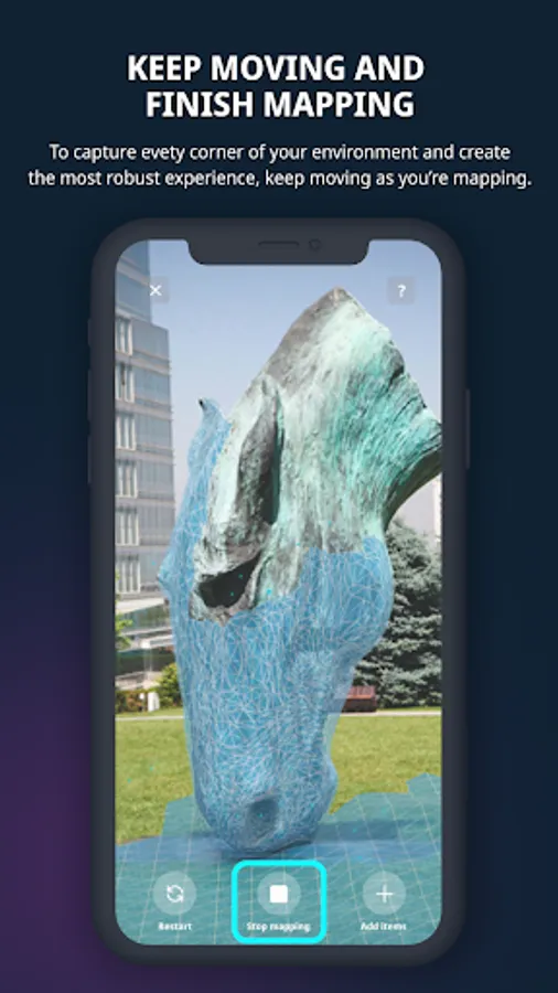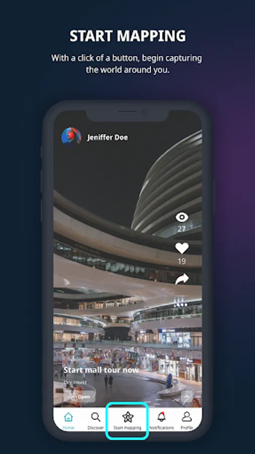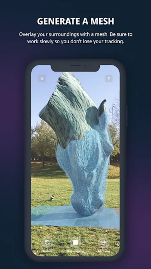 Get started in seconds with the touch of a screen. Select the star icon to start mapping before carefully adding a mesh overlay to your surroundings while you continue to move and capture every inch of the area around you. View, edit, add your location, create a title and description, and access a link to your universe that you can quickly share with the rest of the world.