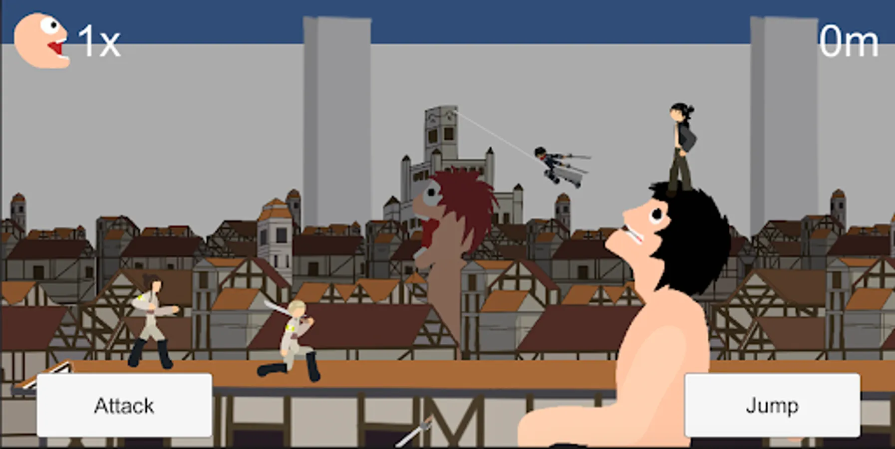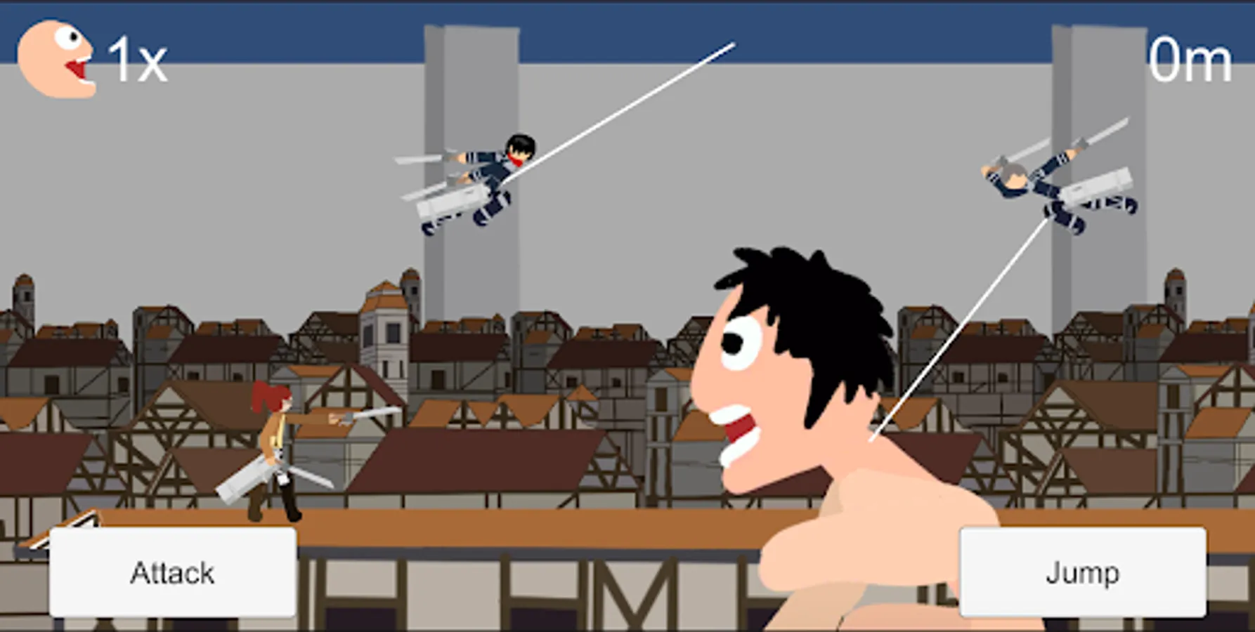 Jump through tall buildings, swing and fly using 3D maneuvering gears, to kill all the giant stickman.
