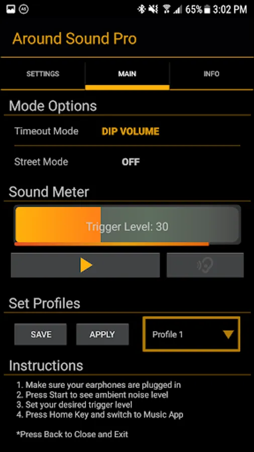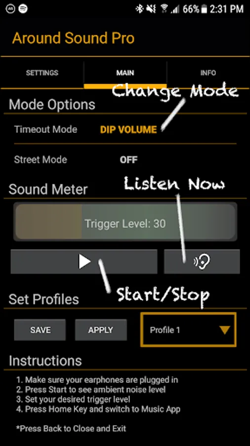Make sure your headset is plugged in. Simply start the app, push Start, see the noise level around you, set the trigger level by using your finger to swipe the meter, hit the home button to access your music, videos or games and enjoy.
