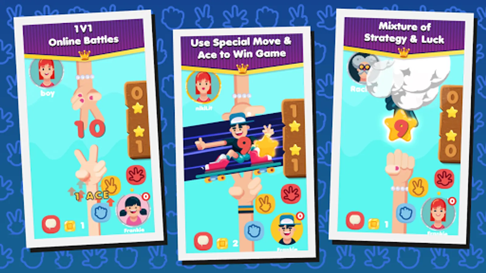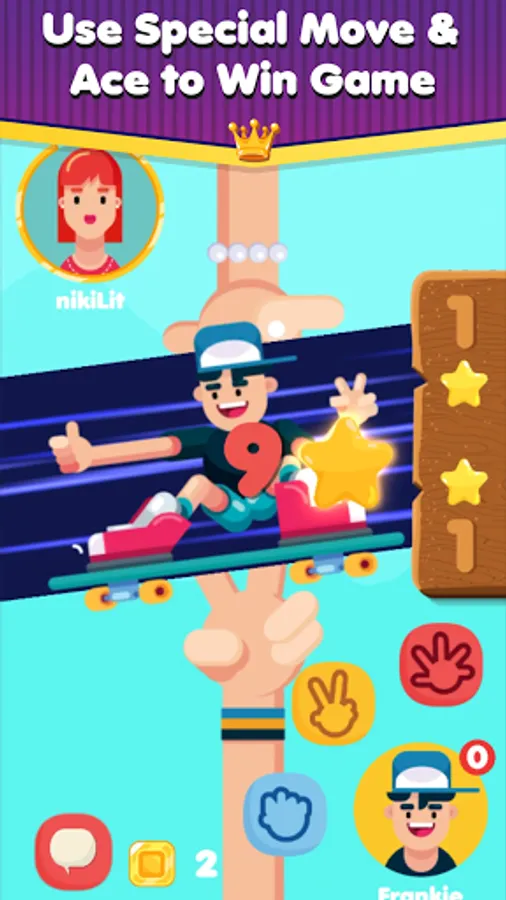 ● Simple easy rock, scissor and paper game but with Ace and Character Special Abilities, it becomes a mixture of strategy and luck