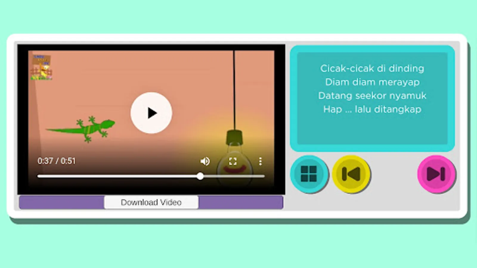 The video content is in accordance with the meaning in the song lyrics with good song quality. This application is a video streaming application for children's songs, but this application can still play offline videos that have been saved with higher quality than when streaming. The quality of streaming video is 240p, while the quality of videos stored offline is 480p - 720p.