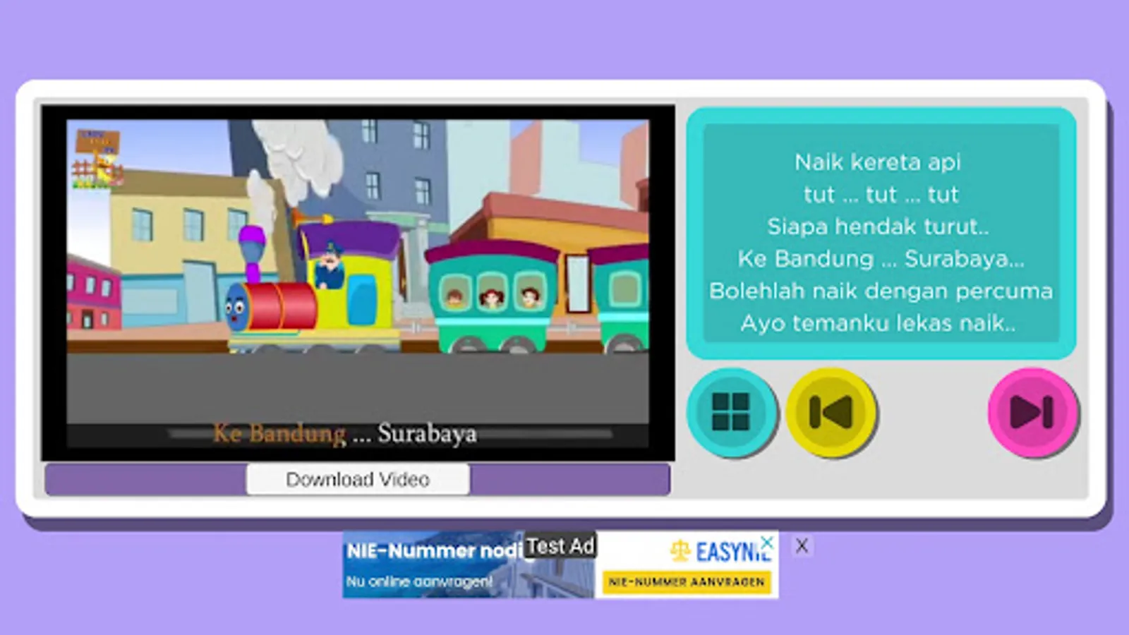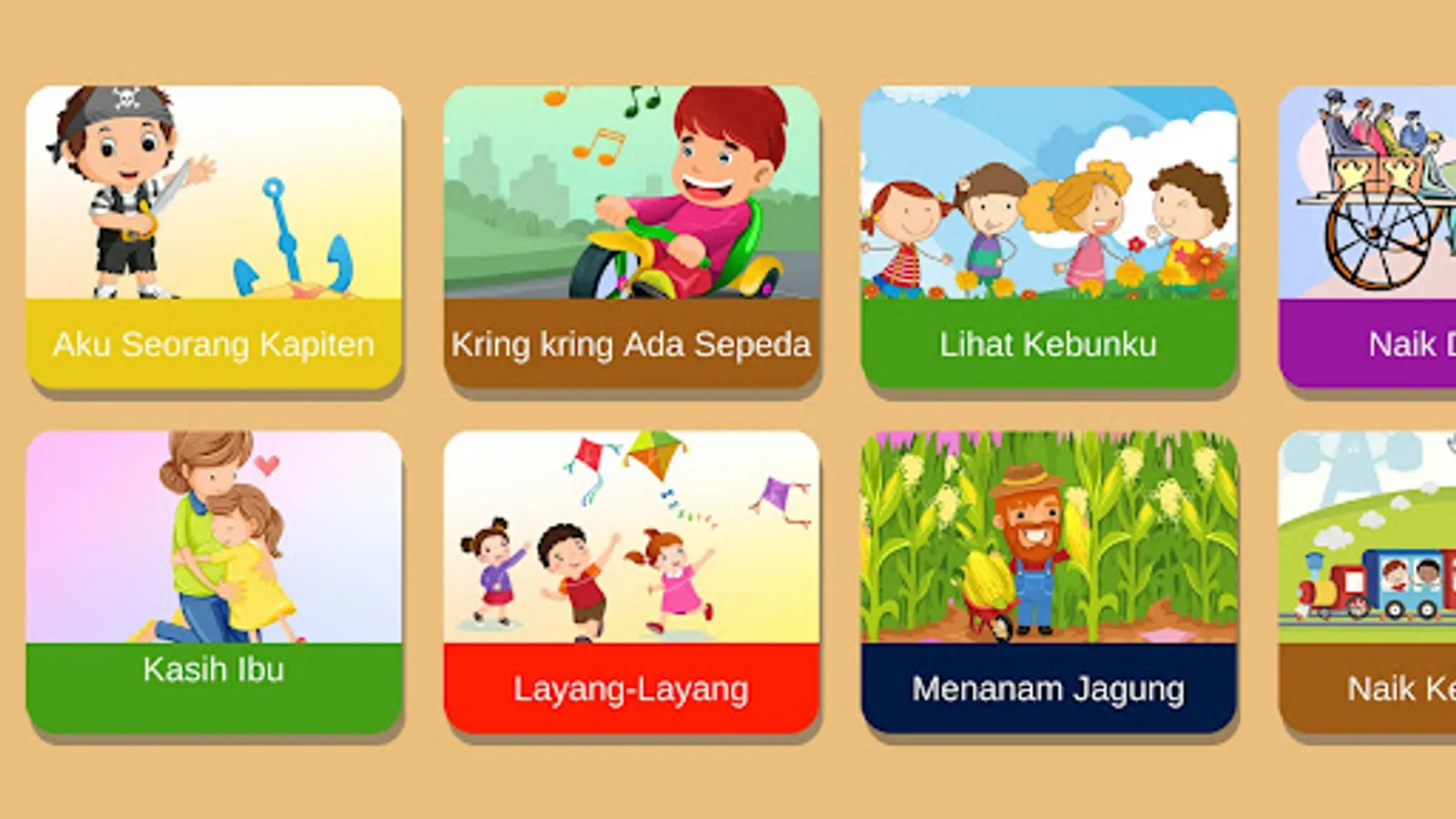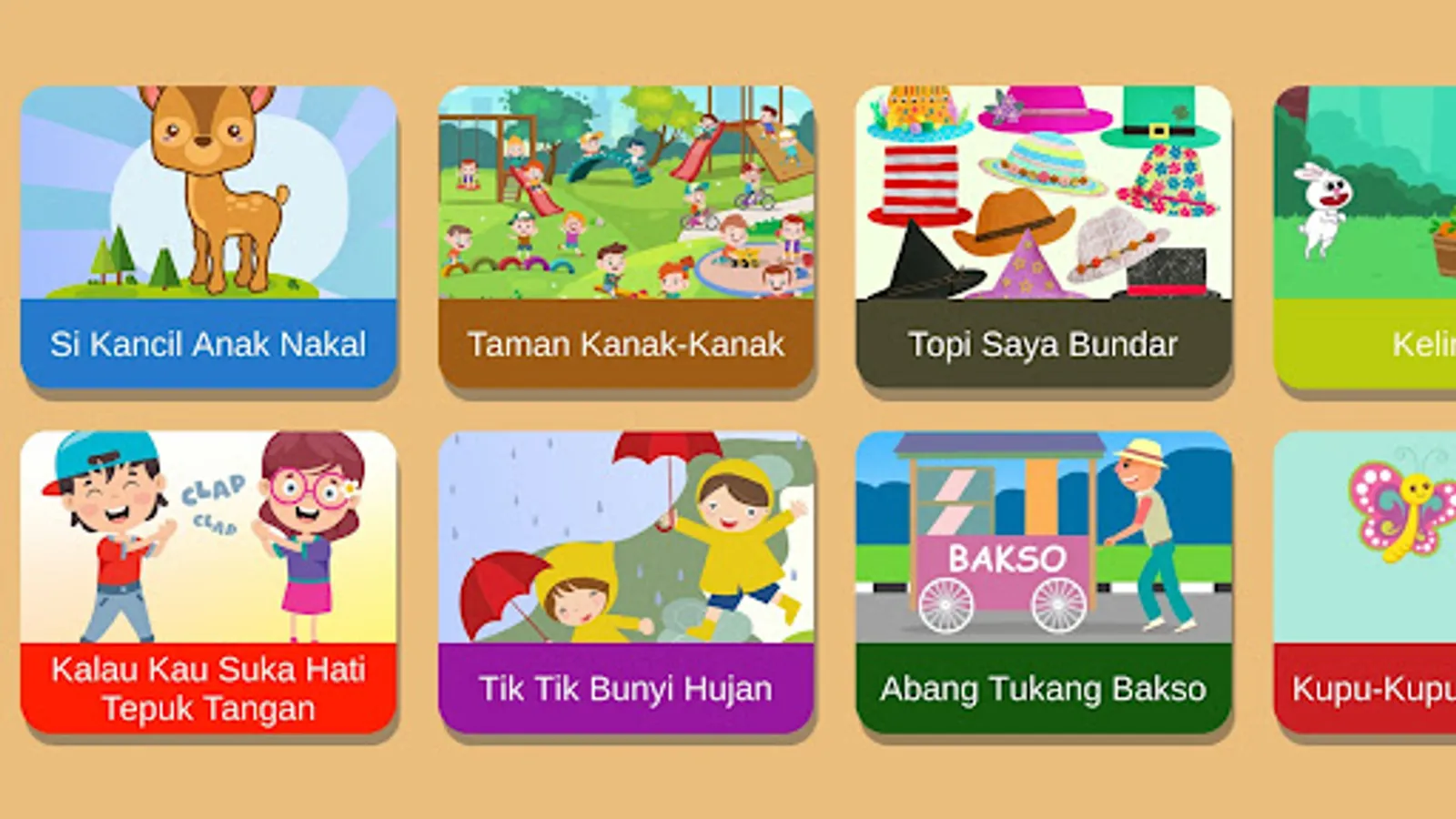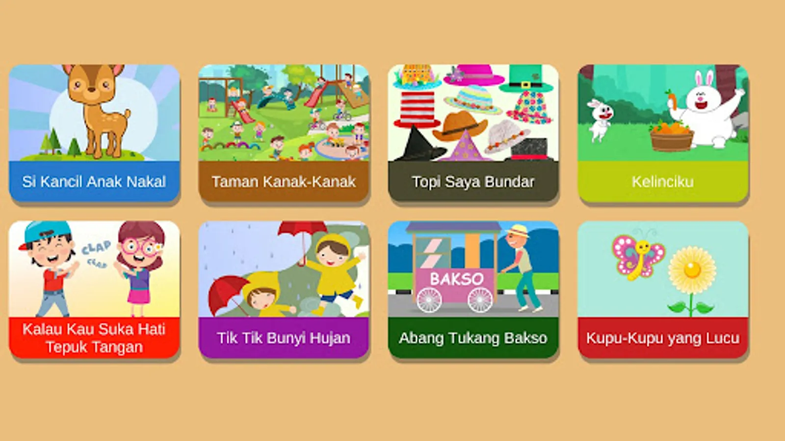 This application contains many videos of popular Indonesian children's songs. Suitable for babies, toddlers, PAUD children, and kindergarten children. Children's song videos in the form of interesting animations so that children are interested and not easily bored. Don't worry about video content, because all the video content in this application is child-friendly.