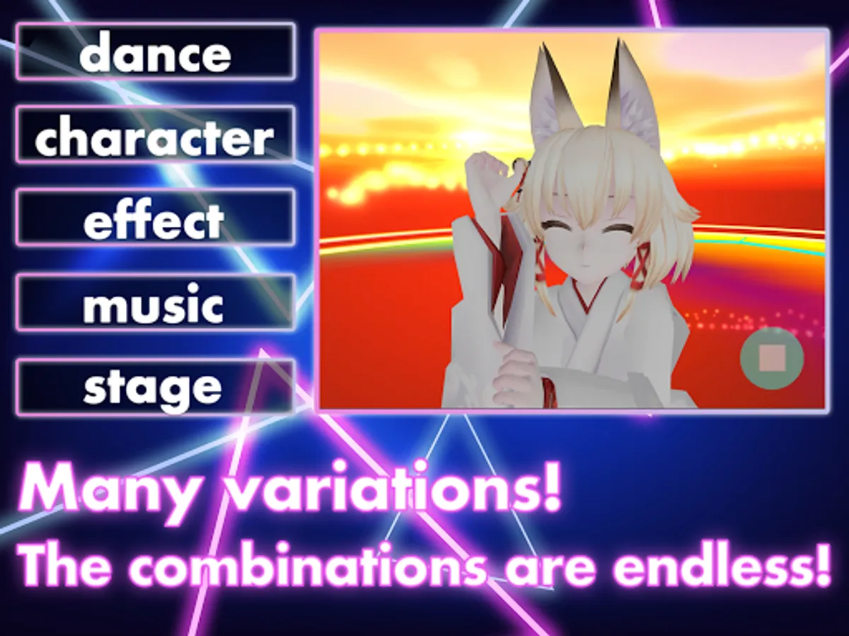 Combine characters, dance animation, music, stage, background, and effects freely.