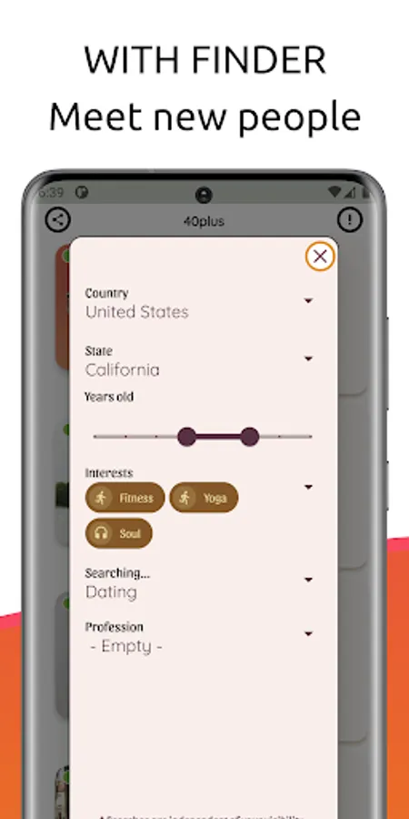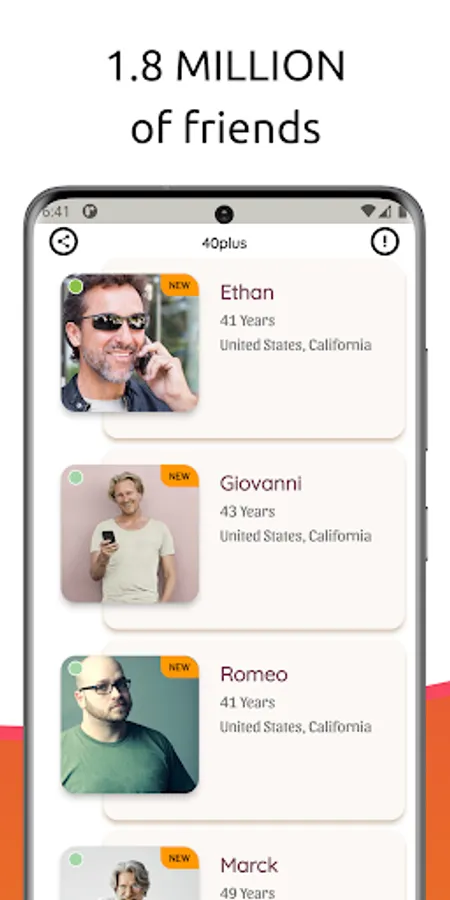 Our app offers a safe and user-friendly environment where senior singles can connect with and meet adult friends and seach other based on shared interests and values. Whether you're looking for friendship, romance, or a long-term relationship, our app is the perfect place to start.