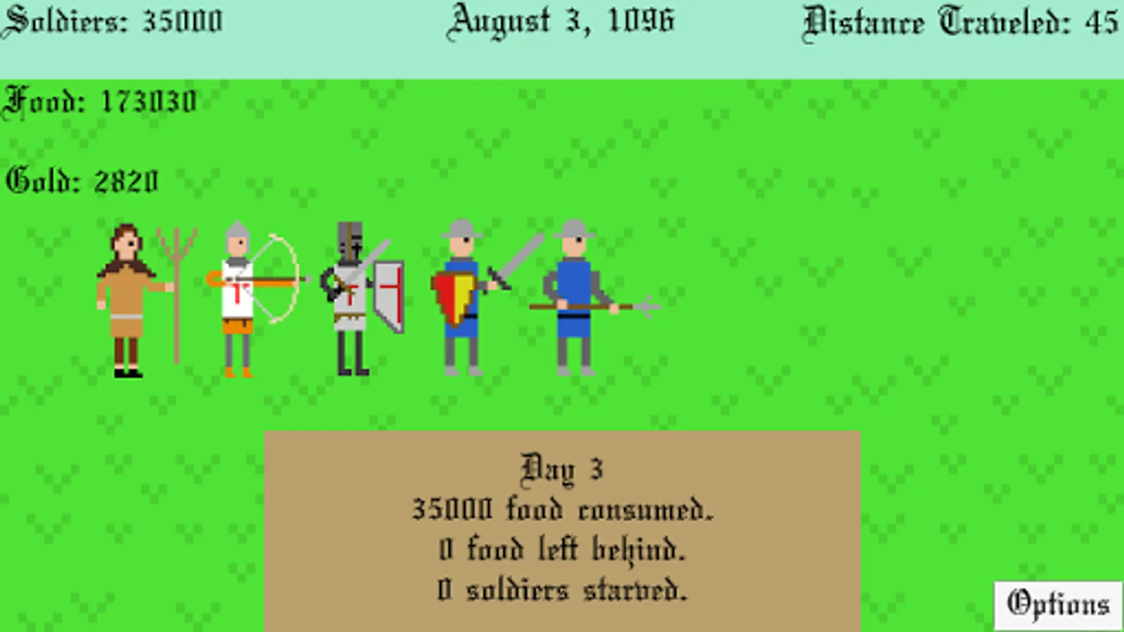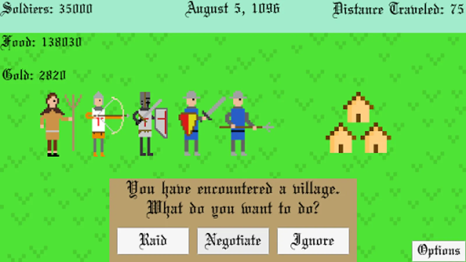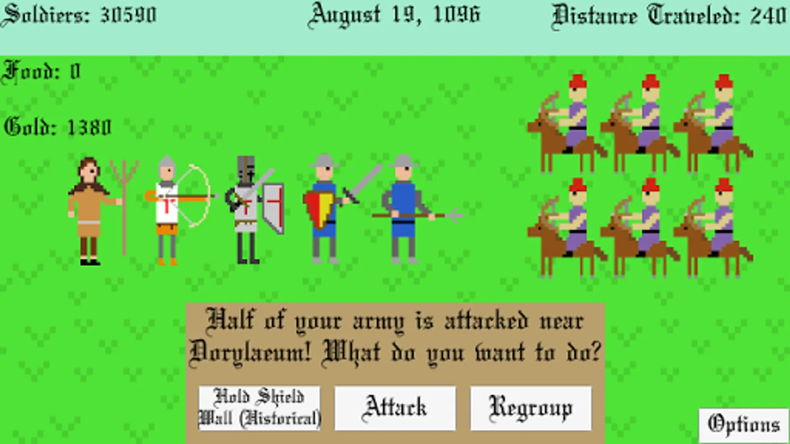 Lead the Crusader Army to the Holy Land and claim Jerusalem! The Crusades is a simulation game where you take control of the Crusades. You make various decisions along the way that determines the fate of the Crusades. Conquer Jerusalem for victory!
