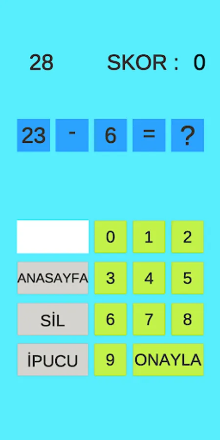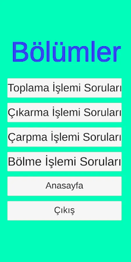 Mathematics is an exercise to perform four operations faster. It asks the addition, subtraction, multiplication, division operations according to the selection in the range of 0-10, 0-20, 0-30, ..., 0-100 numbers. Automatically determines the numbers in the selected range. Gives points for each solved question. He asks questions for a while. If it is not done within the period, it returns to the beginning.