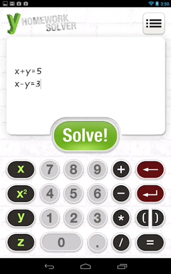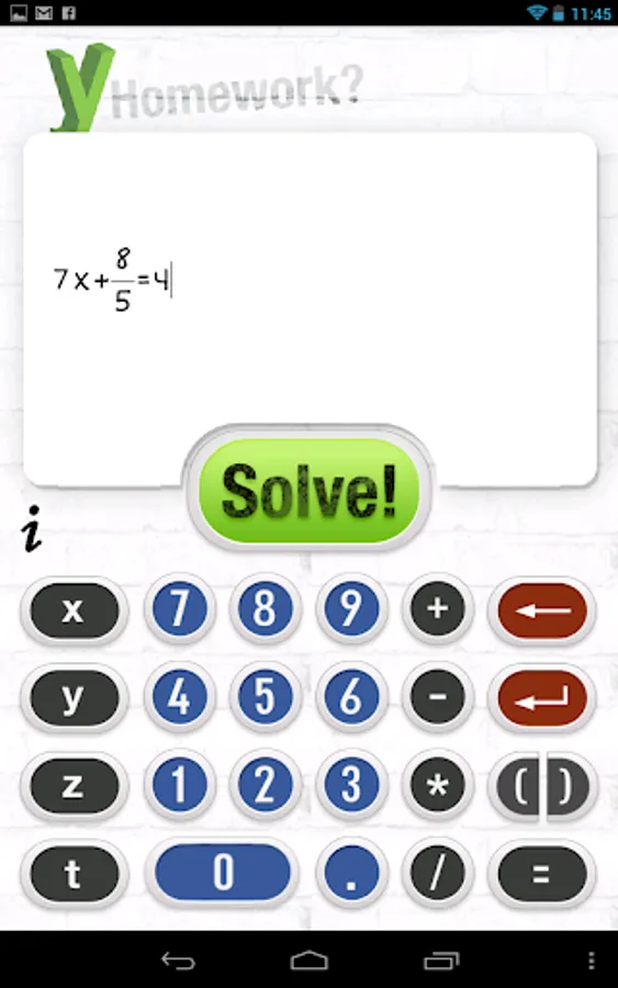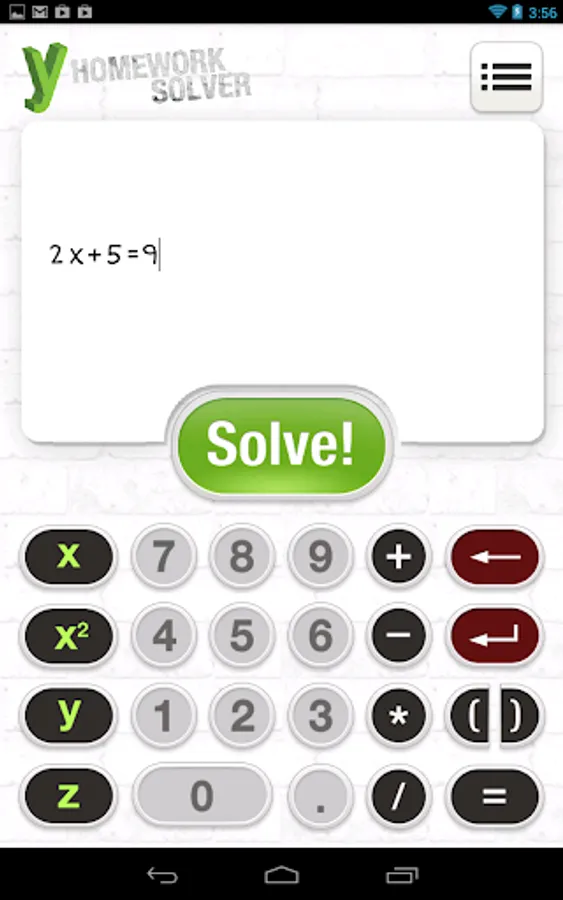 yHomework is an easy to use Math solver, just enter your question or equation, and the app will immediately give you the answer together with the full step-by-step solution!