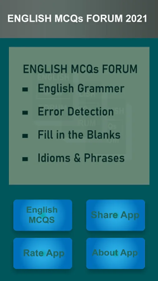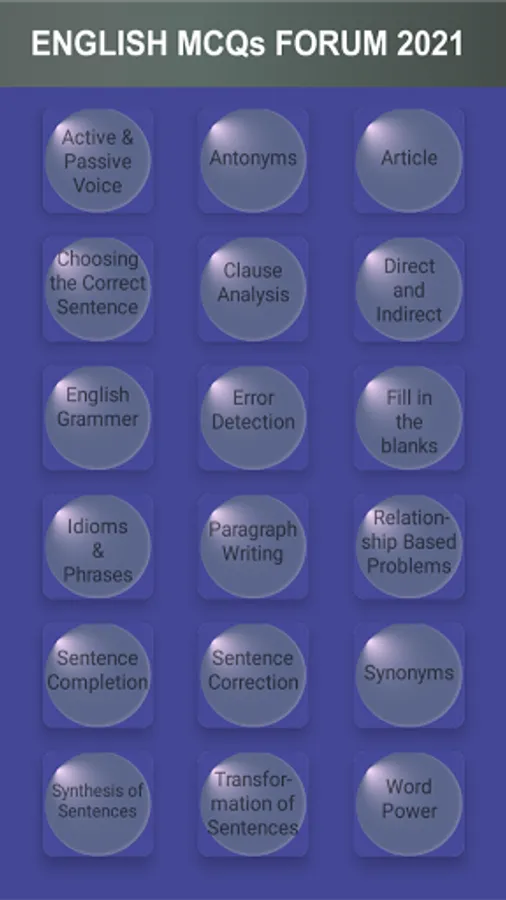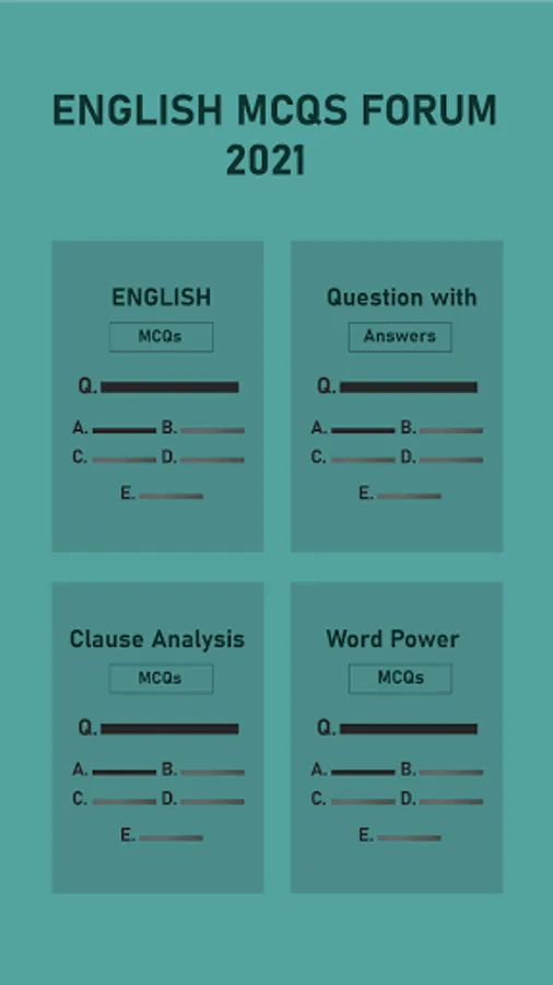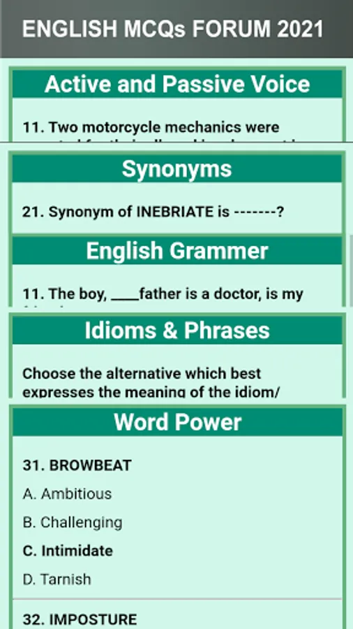 This application covers PPSC, NTS, FPSC, SPSC, KPSC, BPSC, CTS, CSS, UPSC, IAS, IPS, CET, AIEEE, PCS, PMS etc and others exams for English MCQs with categories.