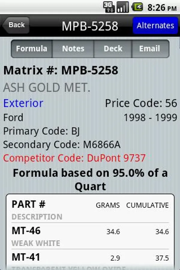 -Detailed formula information including notes, color chip deck, formula details, and actual formulation