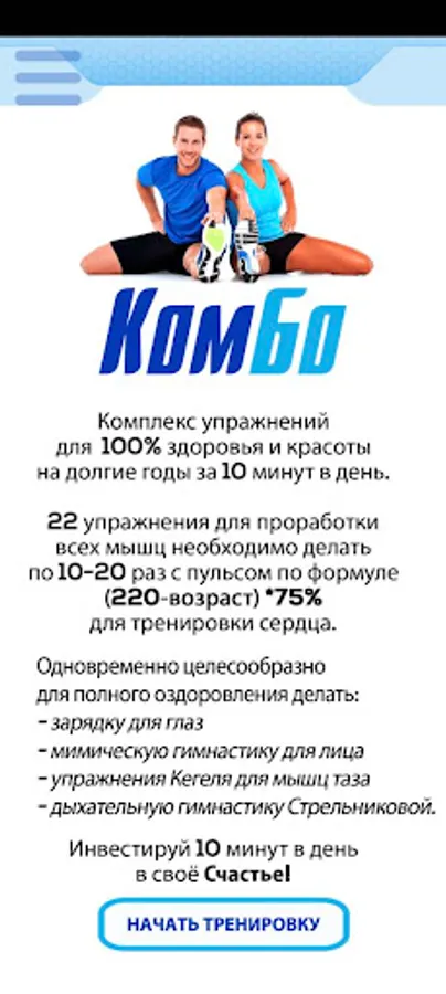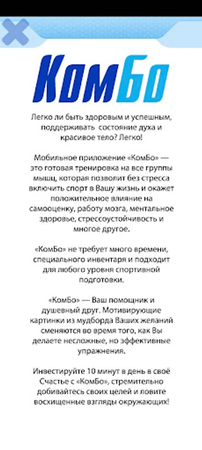 Kombo mobile application is a ready-made workout for all muscle groups that will allow you to include sports in your life without stress and will have a positive impact on self-esteem, brain function, mental health, stress tolerance and much more.