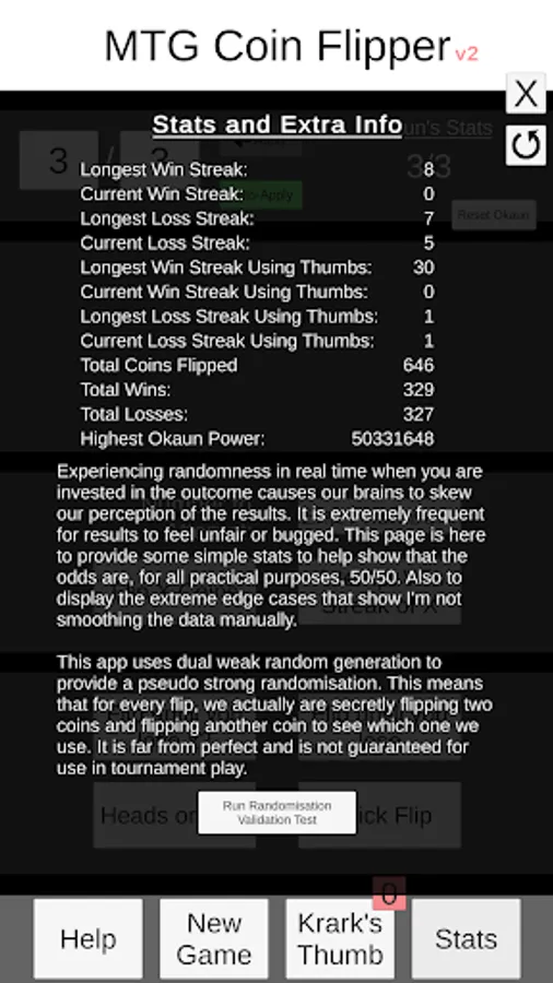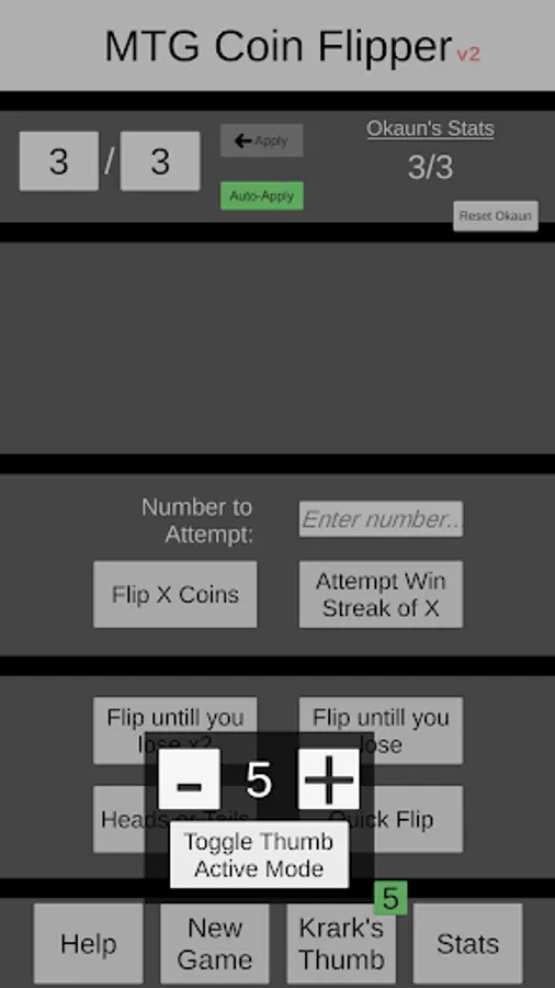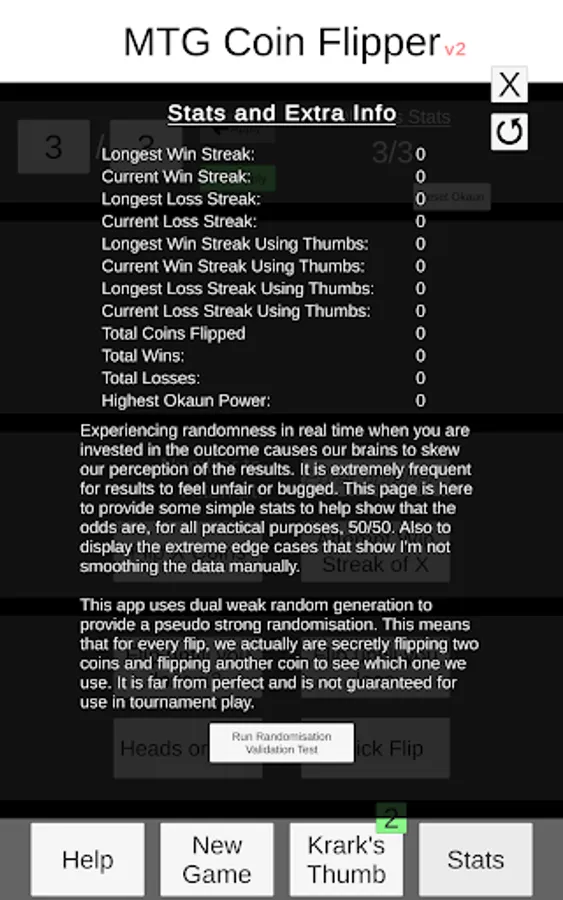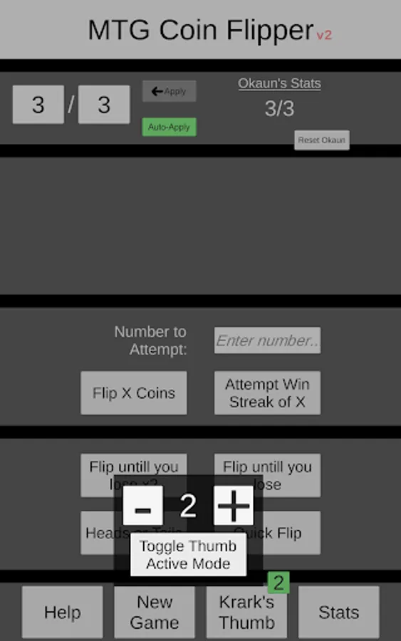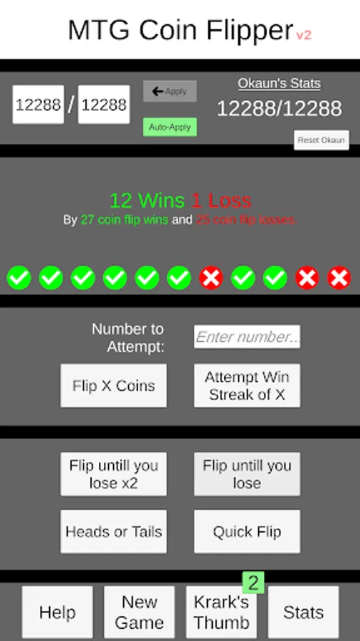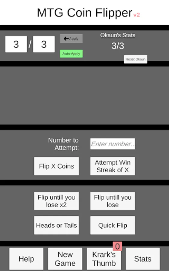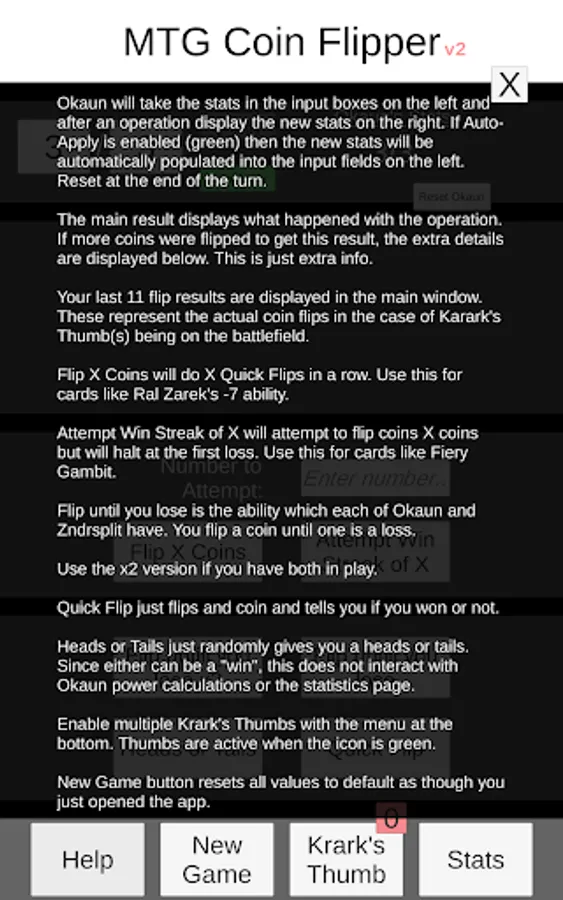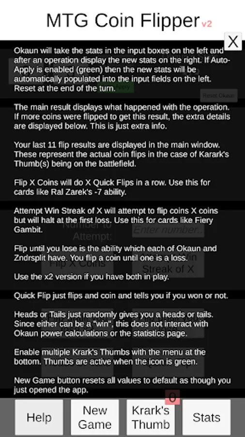 This app is designed to streamline coin flipping decks in Magic the Gathering. Many coin flip cards take a very long time to resolve, especially if you have Krark's Thumb in play. This app lets you very quickly handle coin flipping and automates some of the math around Okaun's Stats. This is a replacement for my old MTG Coin Flipper app and comes with several new features.