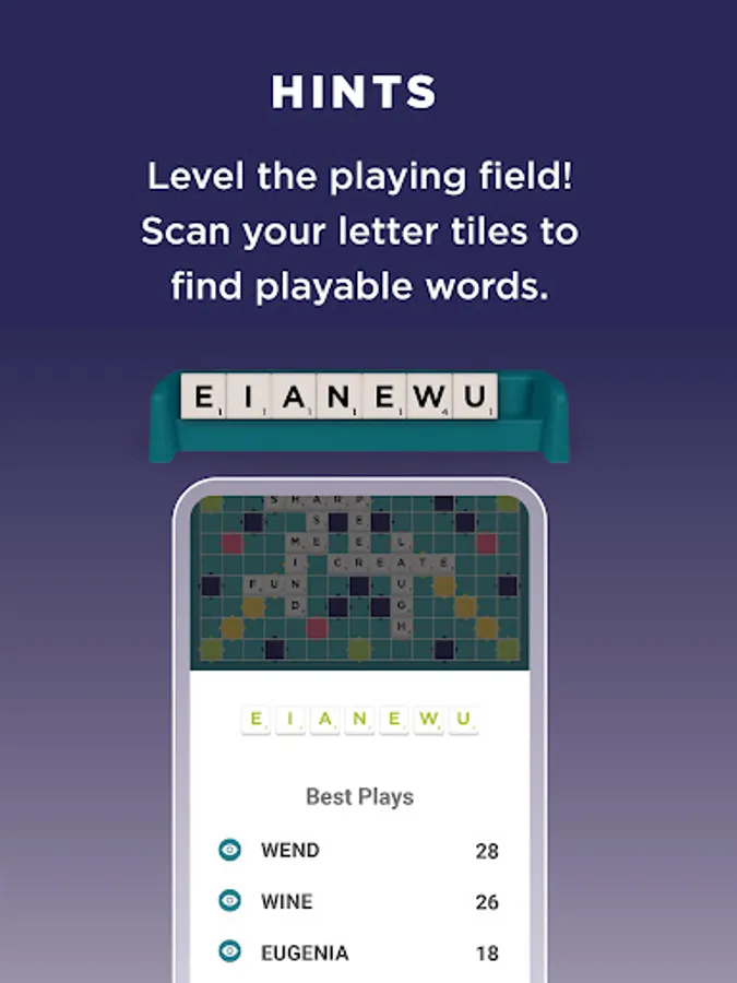 Word hints level the playing field. The app can scan your letter tiles to find playable words.