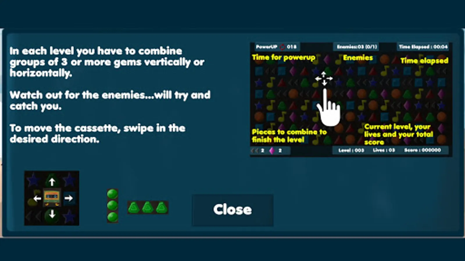 In each level you have to combine groups of 3 or more gems vertically or horizontally.