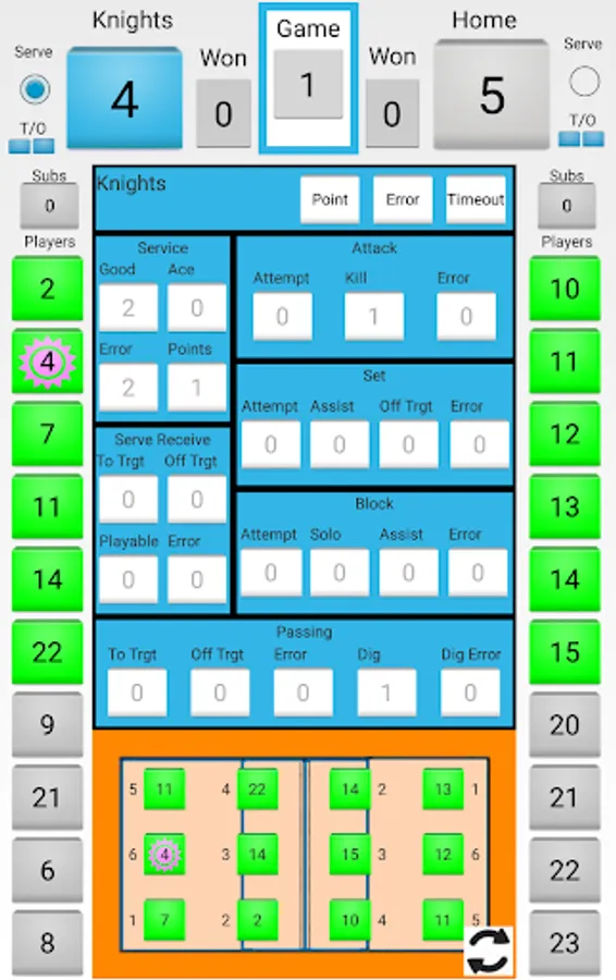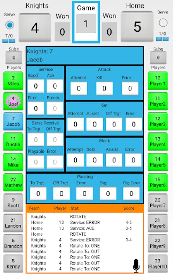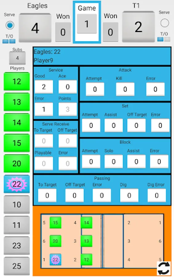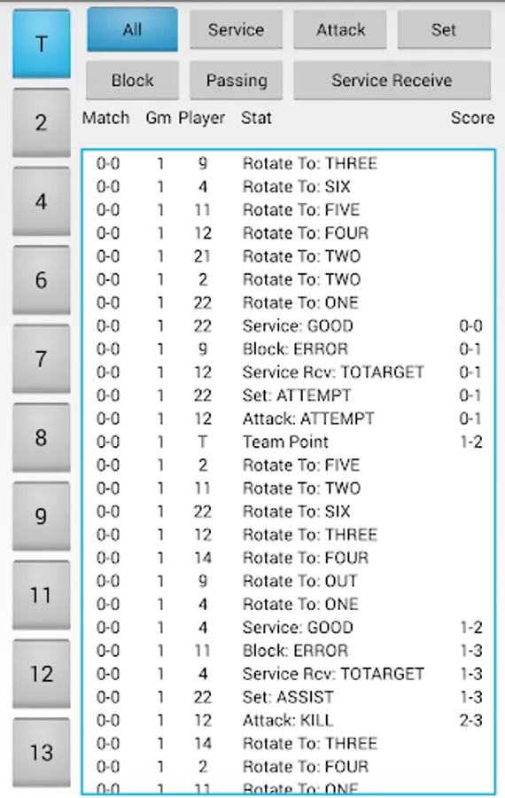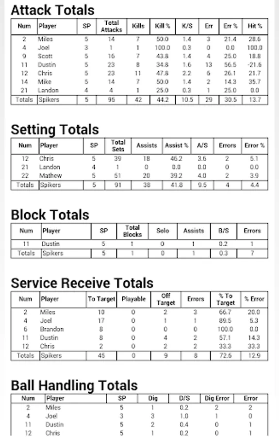 - Serving, Attacks, Ball Handling, Service Receive, Setting, Blocks