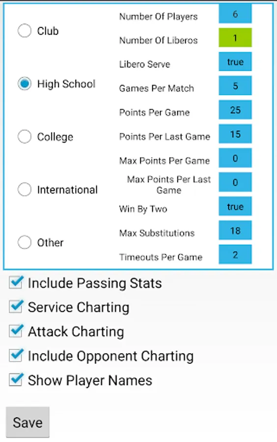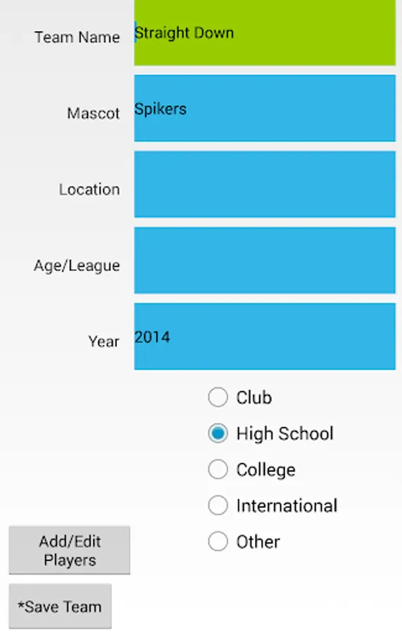 - Select Match Type - High School, College, International, Club, Other (User defined)