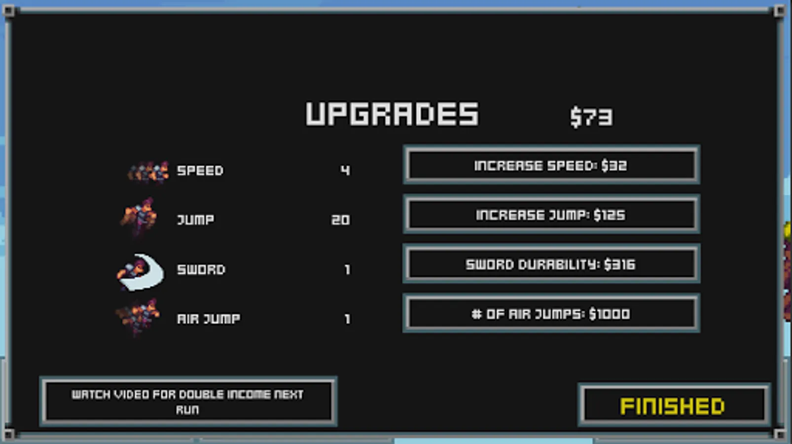 Use the credits to upgrade the Sky Runner's speed, jump power, and more!