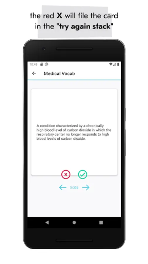 As a study tool, you can quiz yourself on any card using the flashcard feature. If you get the answer right, you can place the card in the “Answered Correctly” pile. If you get the answer wrong, you can place the card in the “Answered Incorrectly” pile. This allows you to isolate the incorrect cards and quiz yourself on your weak points later.