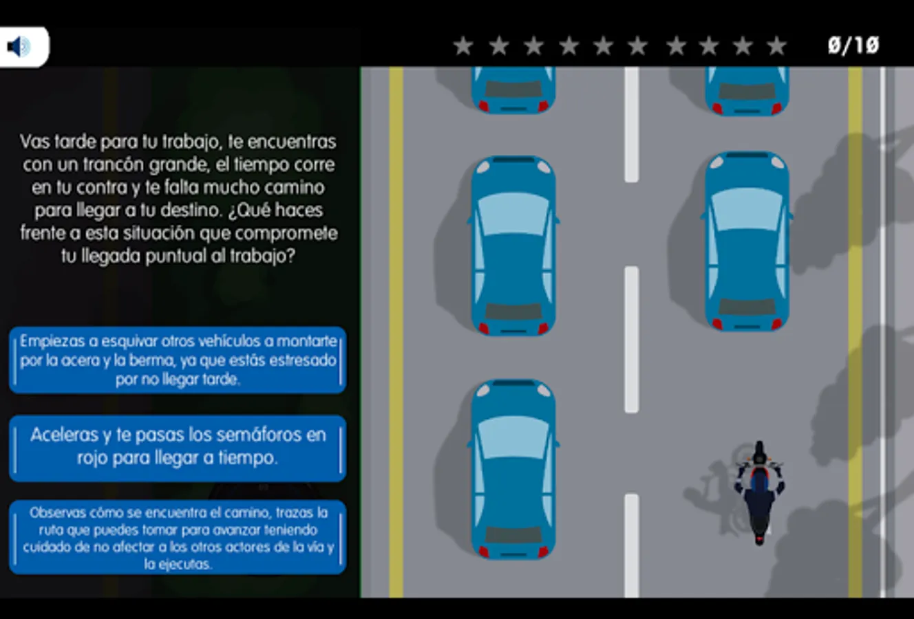 In Auteco social we want to raise awareness about the importance of self-care and that of others when driving a motorcycle, so we have implemented an interactive course to give people essential elements that will strengthen them as exemplary motorcyclists. This virtual experience, based on the e-learning methodology, provides personalized training and addresses topics focused on the responsible driving of motorcycles and the relationship with the other actors on the road.