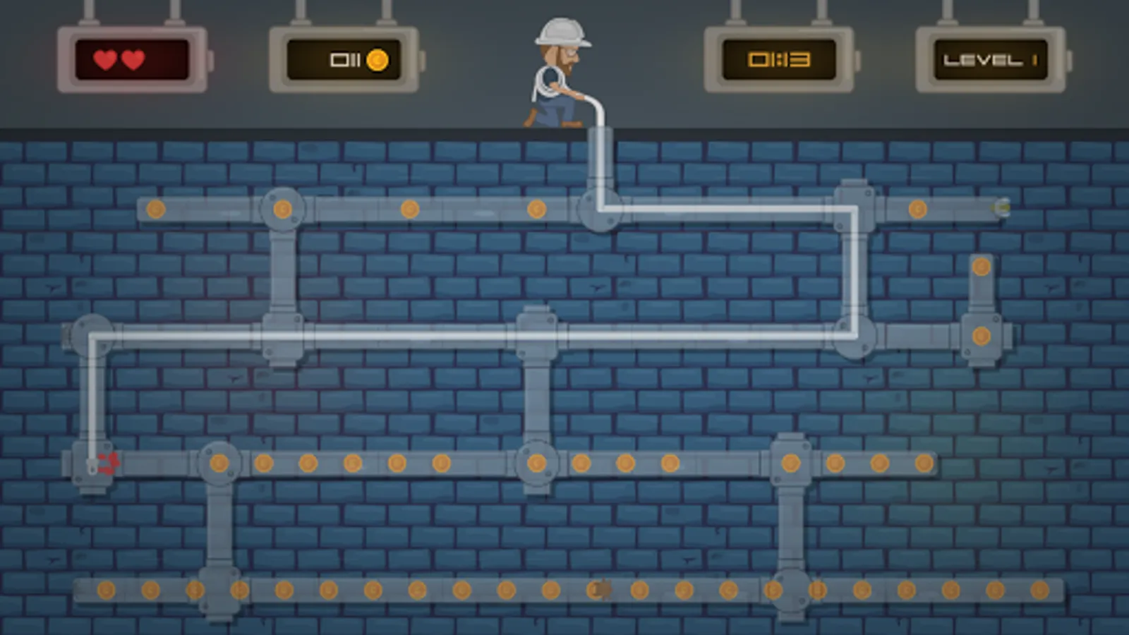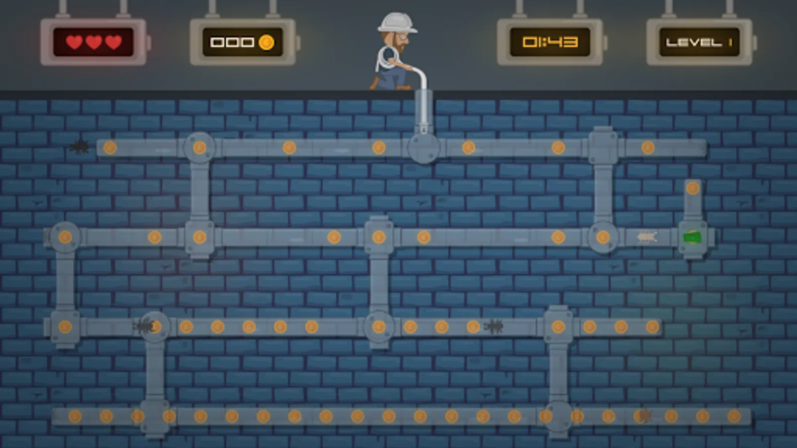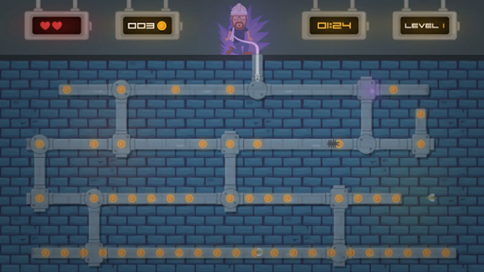 John The Electrician "Electrician John" must collect all coins to get to the next level. Be careful about the insects that destroy his migratory spring. John The Electrician can use the tip of the drawbar to get through the pipes