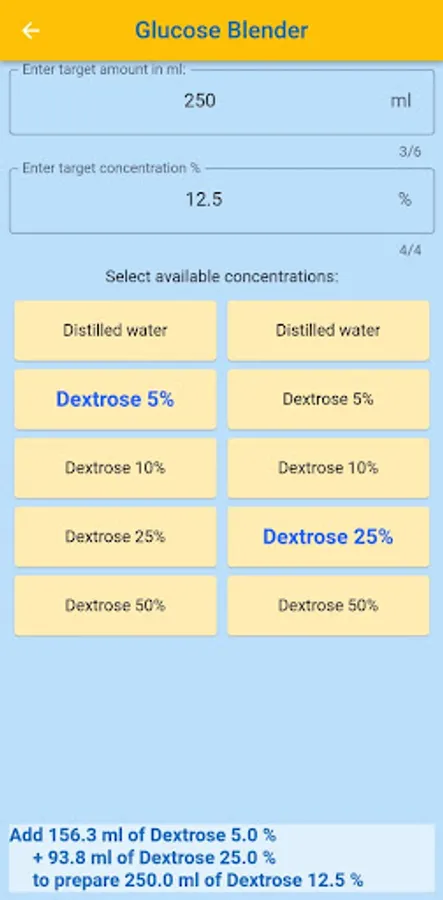 you can prepare any dextrose concentration required using available ready made concentrations (you can select Disilled water, D5W, D10W, D25W or D50W).