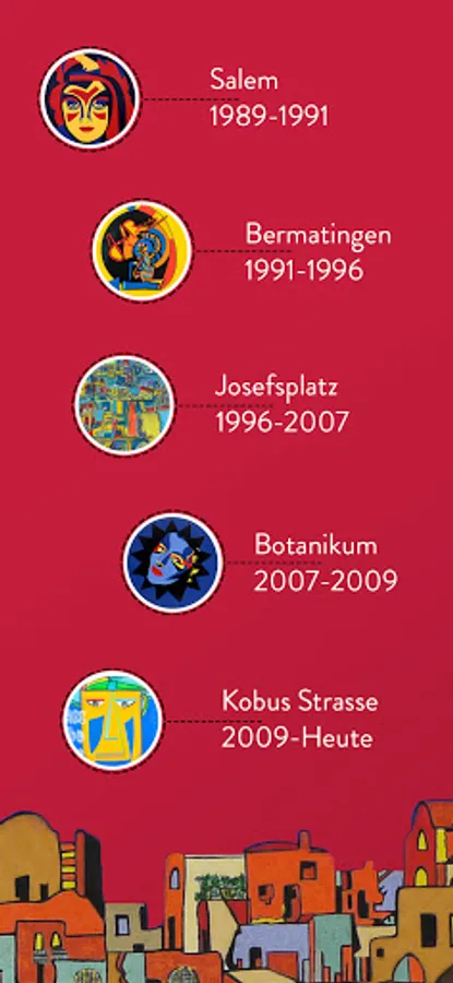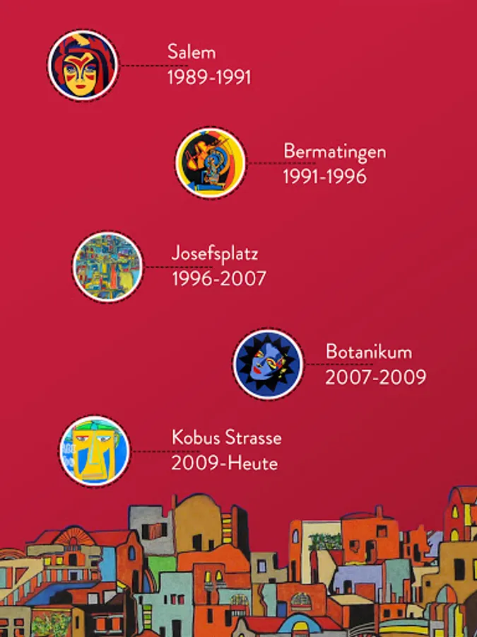 Josef Bauer's creative period took off on Lake Constance - initially in Salem, and a short time later in nearby Bermatingen. In 1996 the artist moved to Josephsplatz in Munich, further to the Botanikum and finally to Kathi-Kobus-Straße in the artists' quarter of Schwabing.