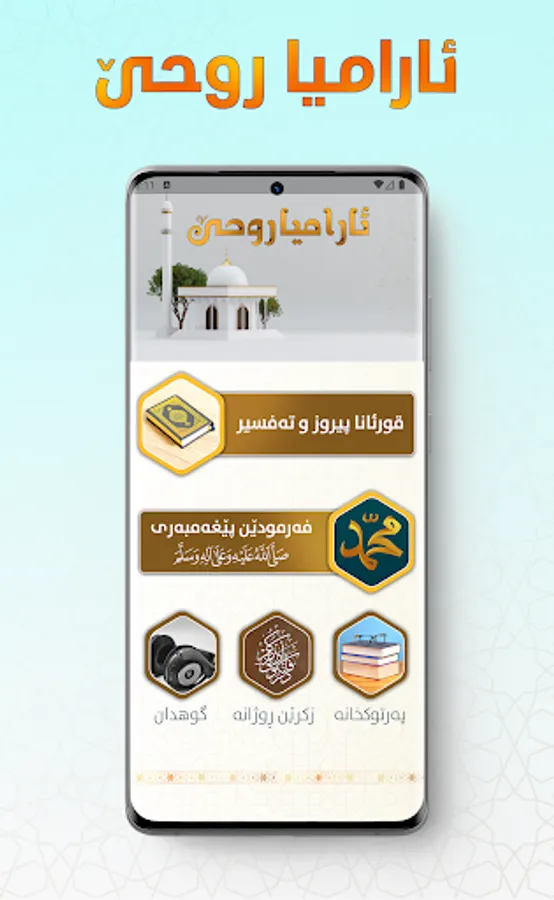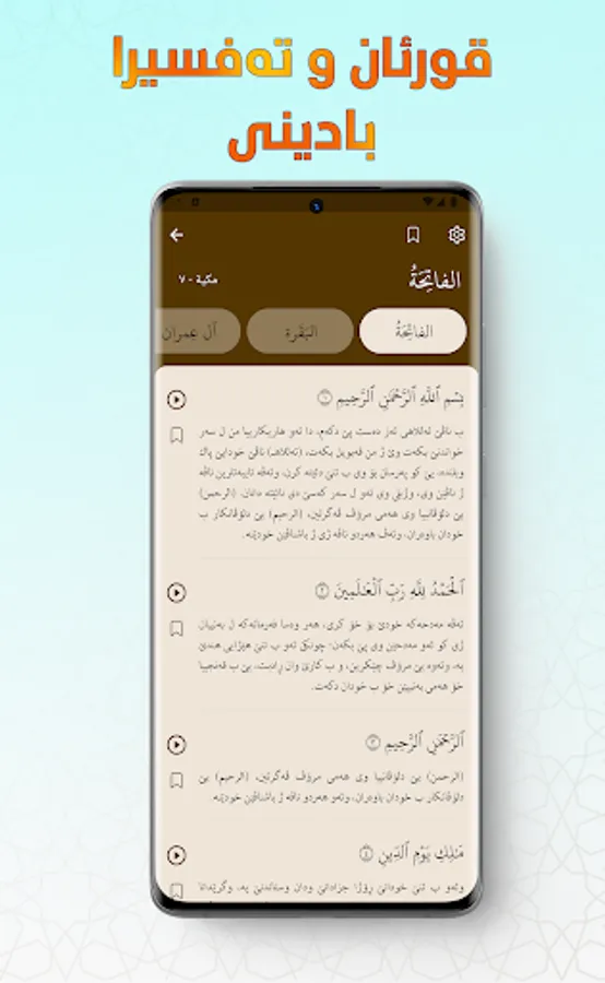 ئێك: بەشێ قورئانا پيروز و تەفسيرێ، كو تو دشێی ل ڤى بەشى قورئانا پيروز و تەفسيرێ ب خينى، و ل ديڤ ئارەزويا خو قەبارێ فونتێ قورئانێ و تەفسيرێ ب گوهرى. هەروەسا تو دشێی گوهداريا قورئانێ بكەى ئەڤە ژى ژ بو وان كەسێن خاندنا وان لاواز دێ مفاى ژێ بينن.