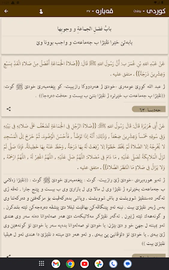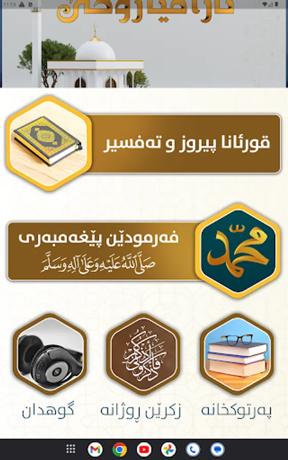 چار : بەشێ فەرموودێن پێغەمبەرى صلى الله عليە وسلم، دڤى بەشى دا تو دشێی ب سەدەها فەرموودێن پێغەمبەرى صلى الله عليە وسلم يێن صەحيح ب خينى ب زمانێ كوردى و عەرەبى و هەروەسا ب ژێدەرڤە.