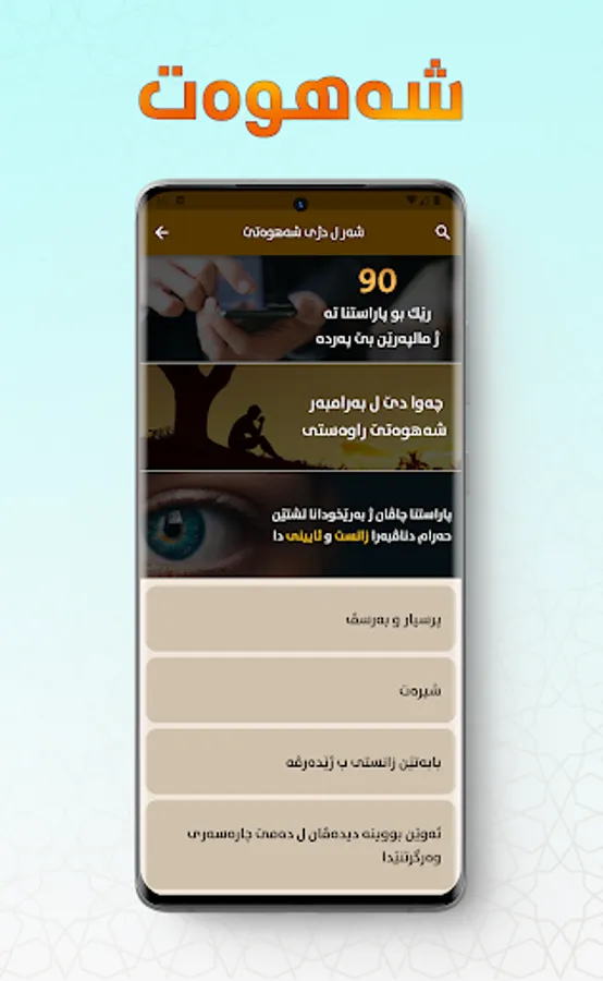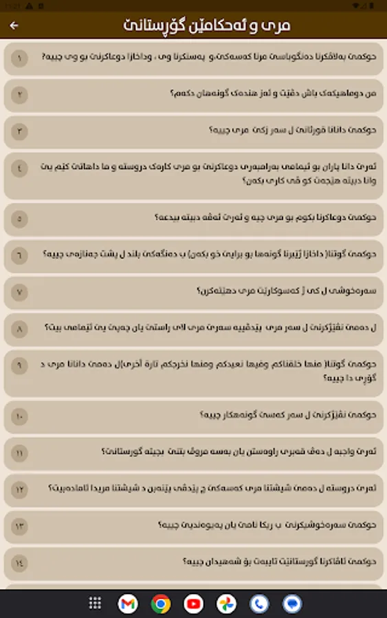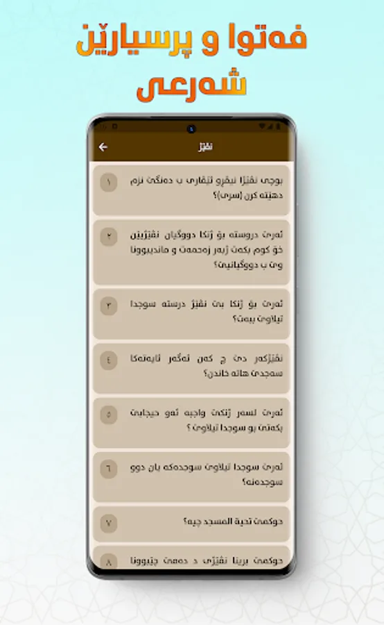 شەش: فەتوايێن شەرعى : ل ڤى بەشى نيزيكێ 500 فەتوا و پرسيارێن شەرعى يێن تێدا هەين دەربارەى بابەتێن جوراوجور، كو يێن هاتينە بەرسڤ دان ژلايێن زانايێن مەزن ڤە و يێن هاتينە وەرگێران بو زمانێ كوردى.