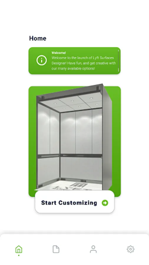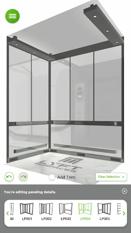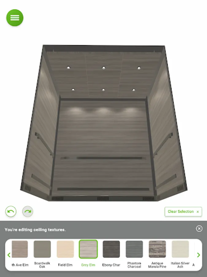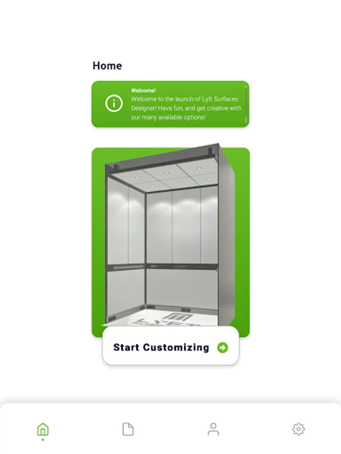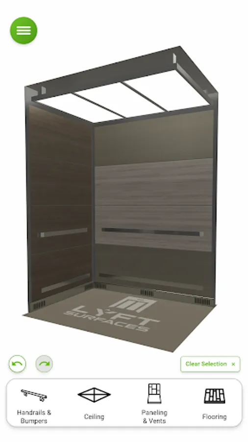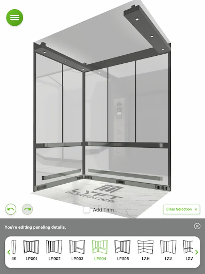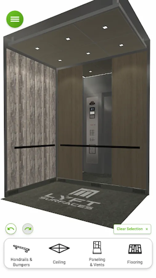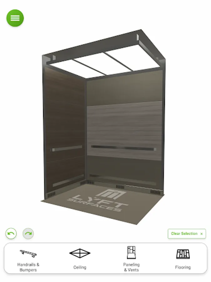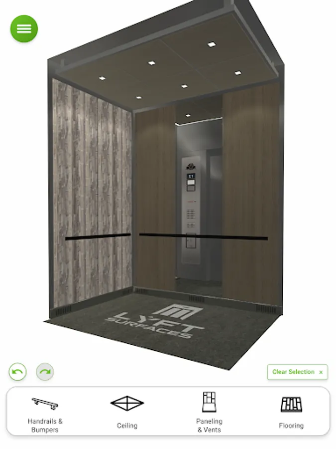 The Lyft Surfaces Designer app is the perfect design tool to assist in the creation, and realization of the perfect elevator interior. Pick the panel layout and the materials and colors for the panels. Pick the ceiling style, material and type of lighting. Pick the style and material for the handrails and even add bumper rails. And of course, choose the color for floor. This handy tool is great for design presentations, sales presentations and for budget pricing.